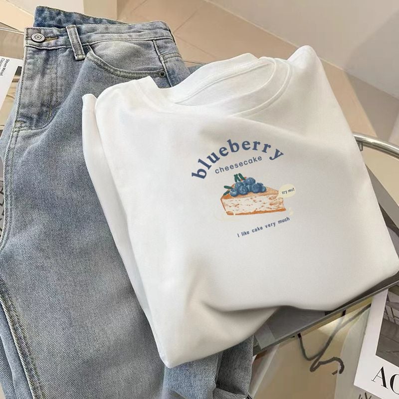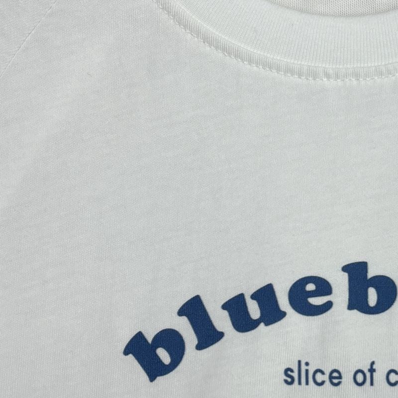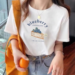 ブルーベリーケーキのイラストが目を惹く、遊び心のあるグラフィックTシャツ。