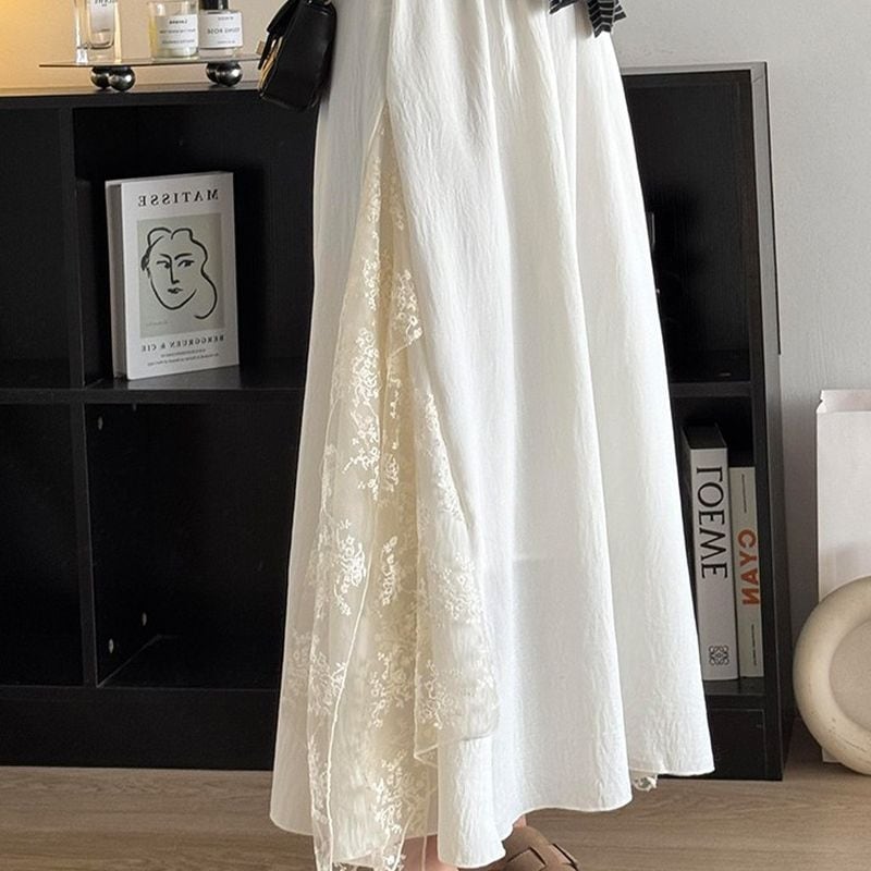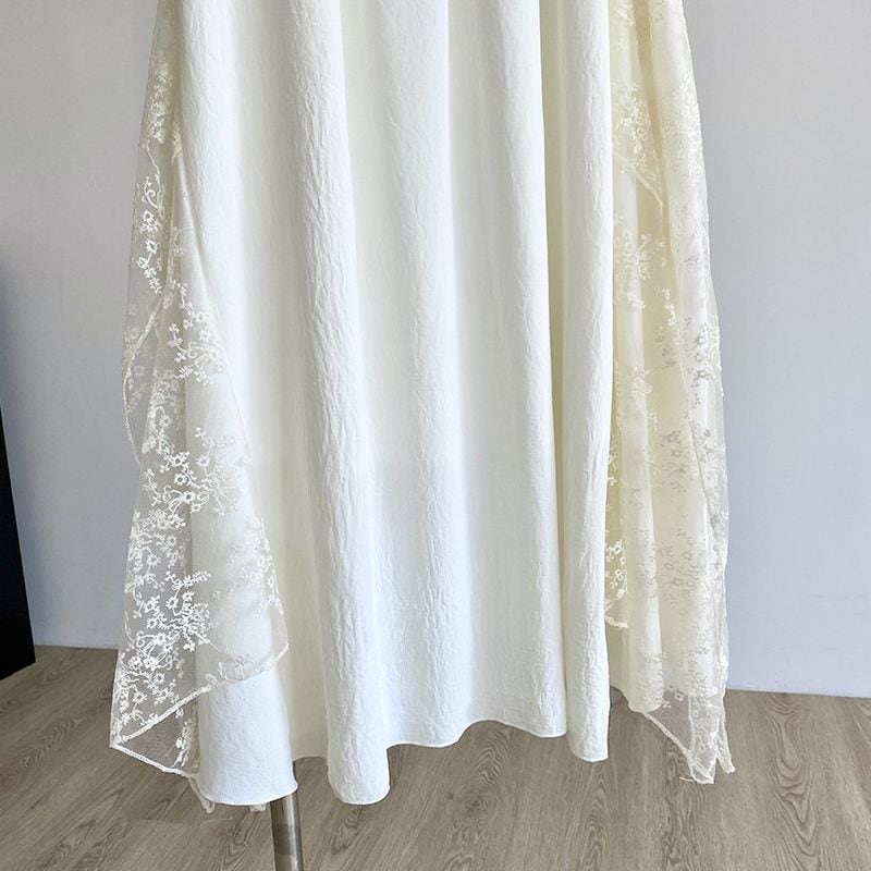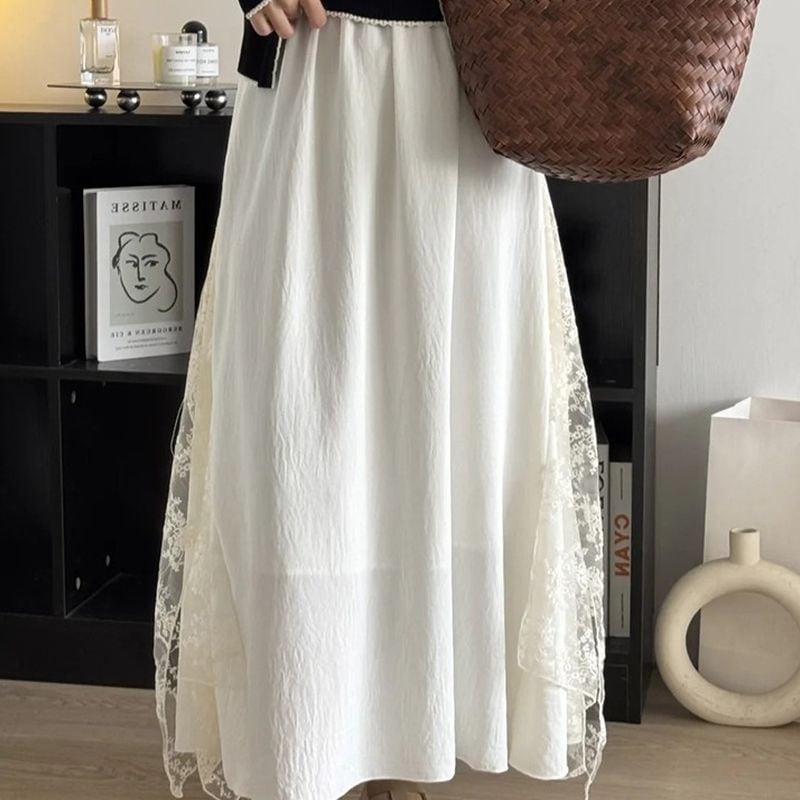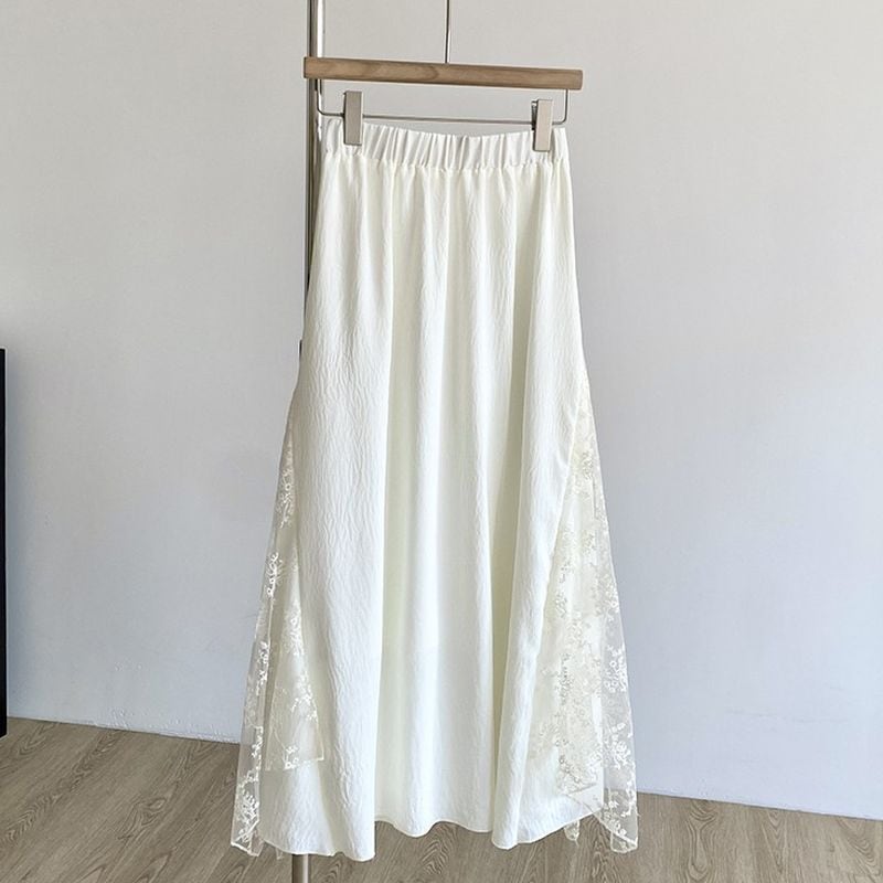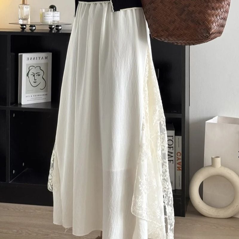 サイドに施されたレースがさりげなく視線を引きつける、上品なロングスカート。