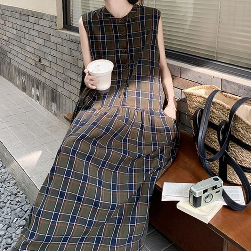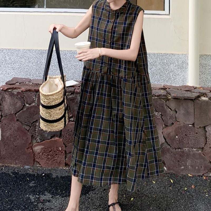 クラシカルなタータンチェックが目を惹く、ノースリーブのレトロワンピース。