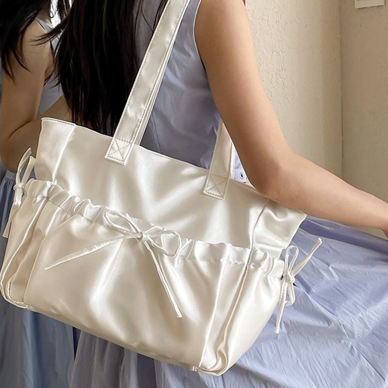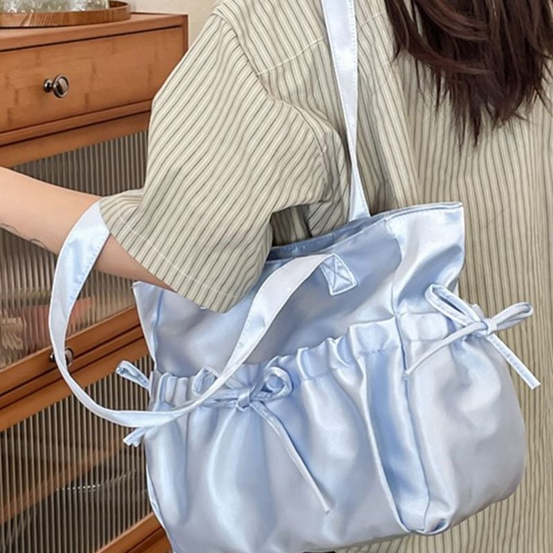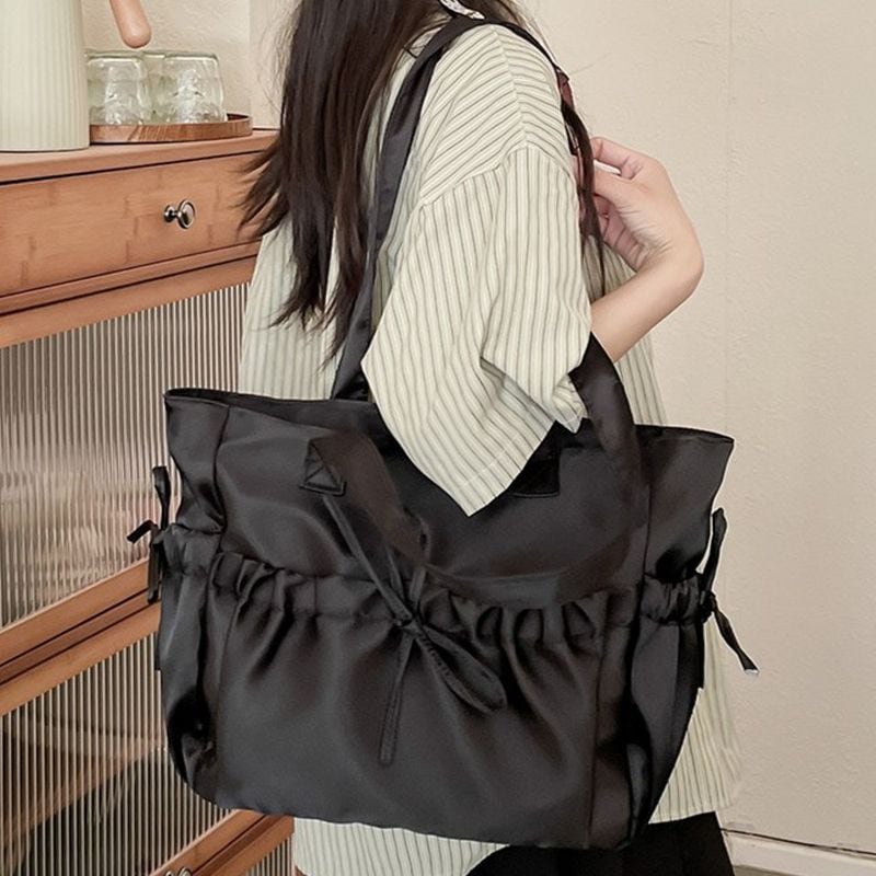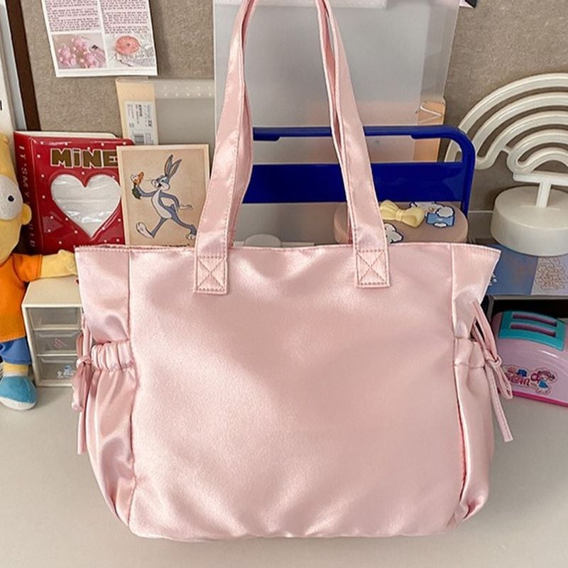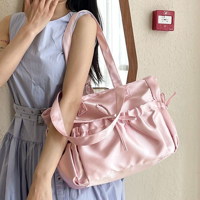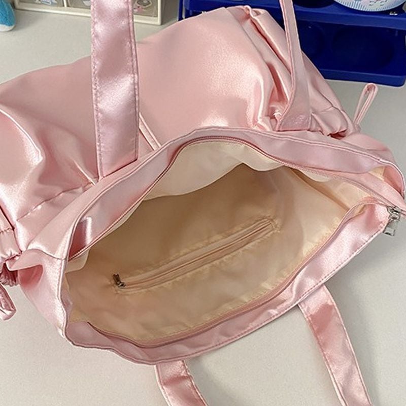 テロンとしたナイロン生地に、ほんのりパールのような光沢が印象的なプリーツトートバッグ。