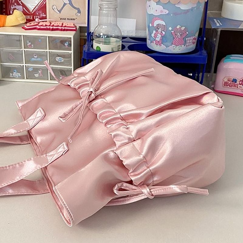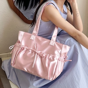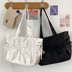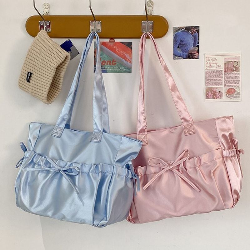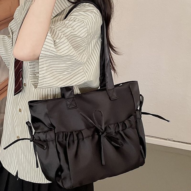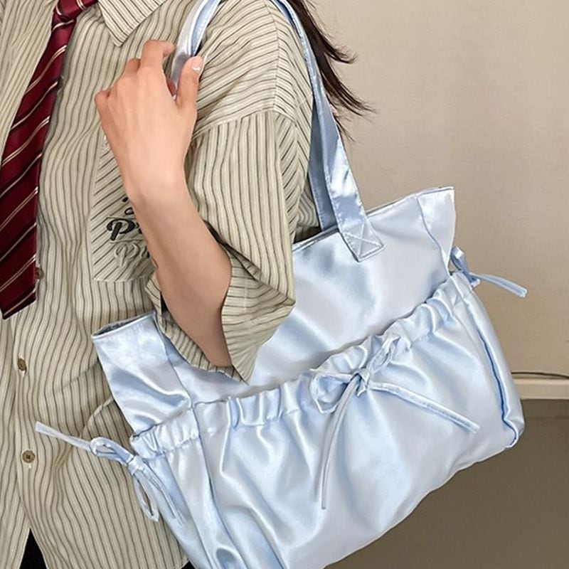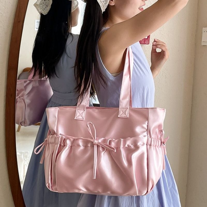 テロンとしたナイロン生地に、ほんのりパールのような光沢が印象的なプリーツトートバッグ。