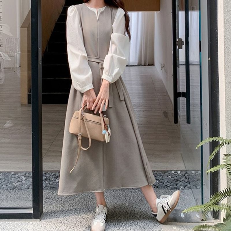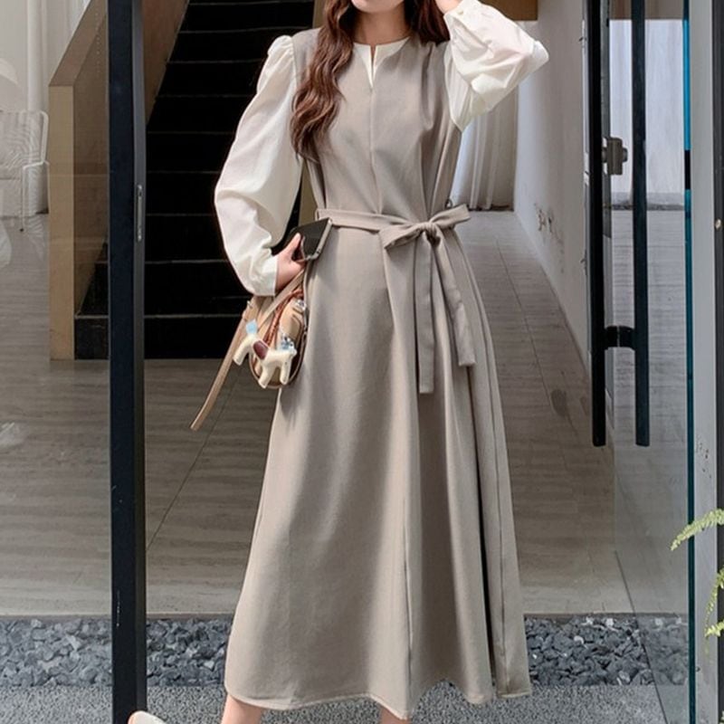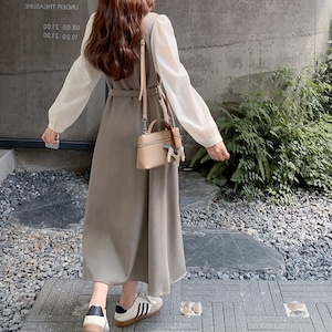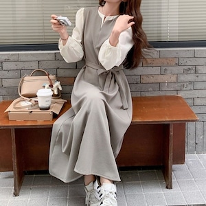 ウエストリボン付きキーネックレイヤードワンピース L1030