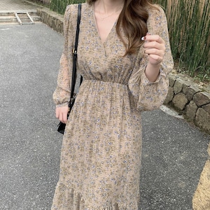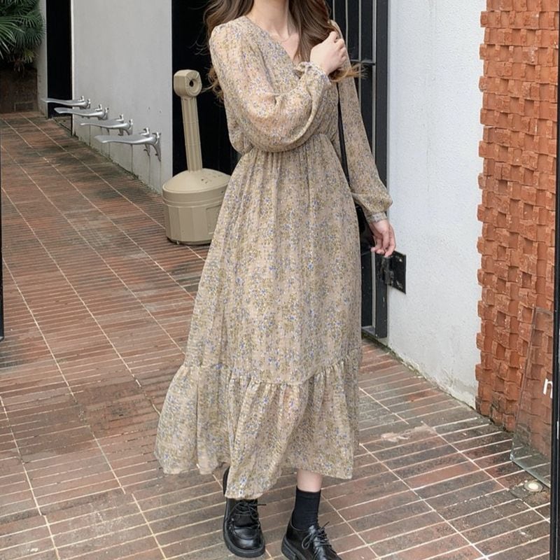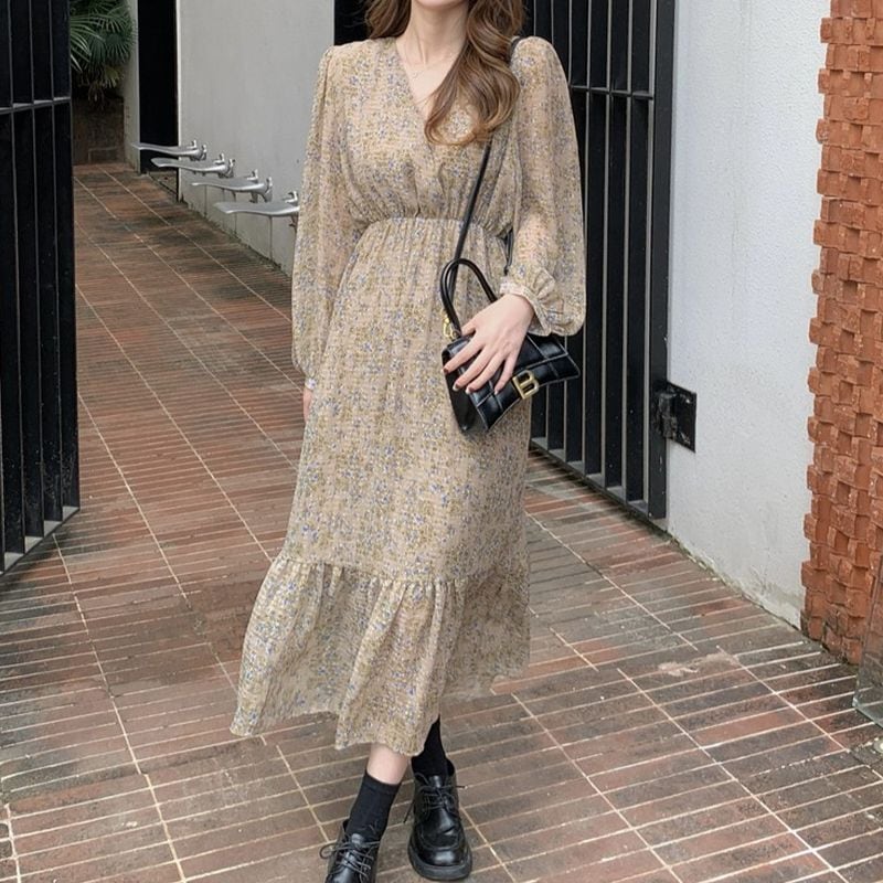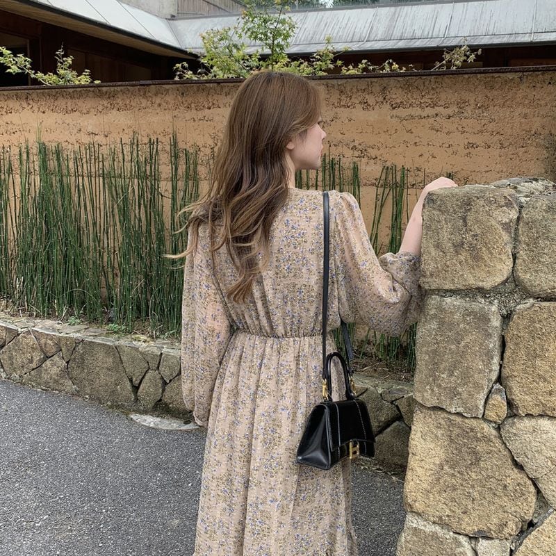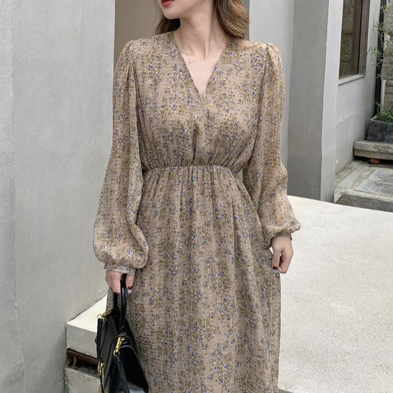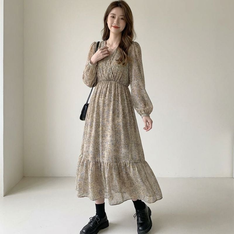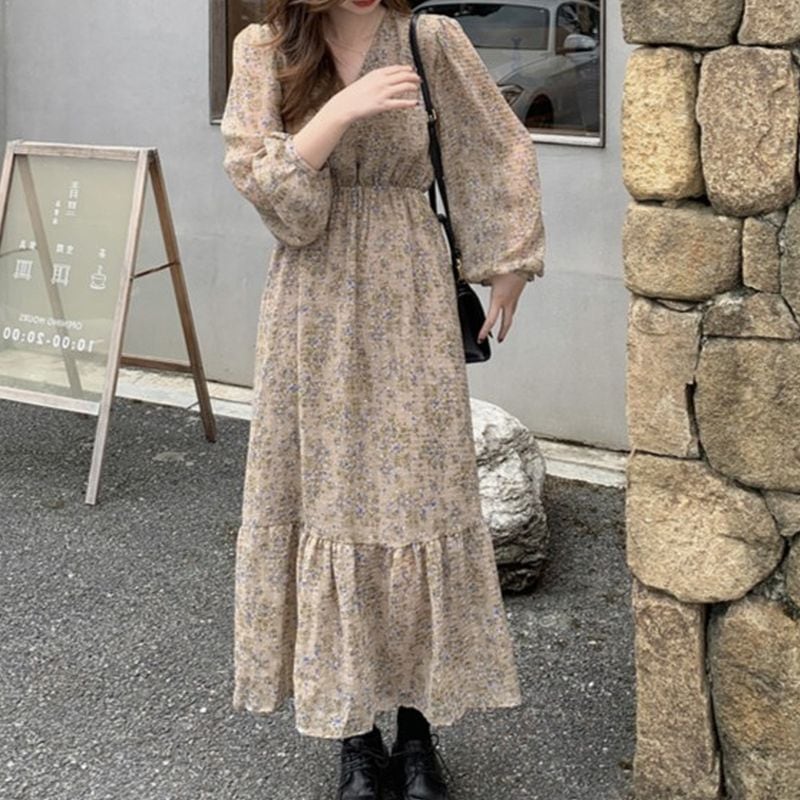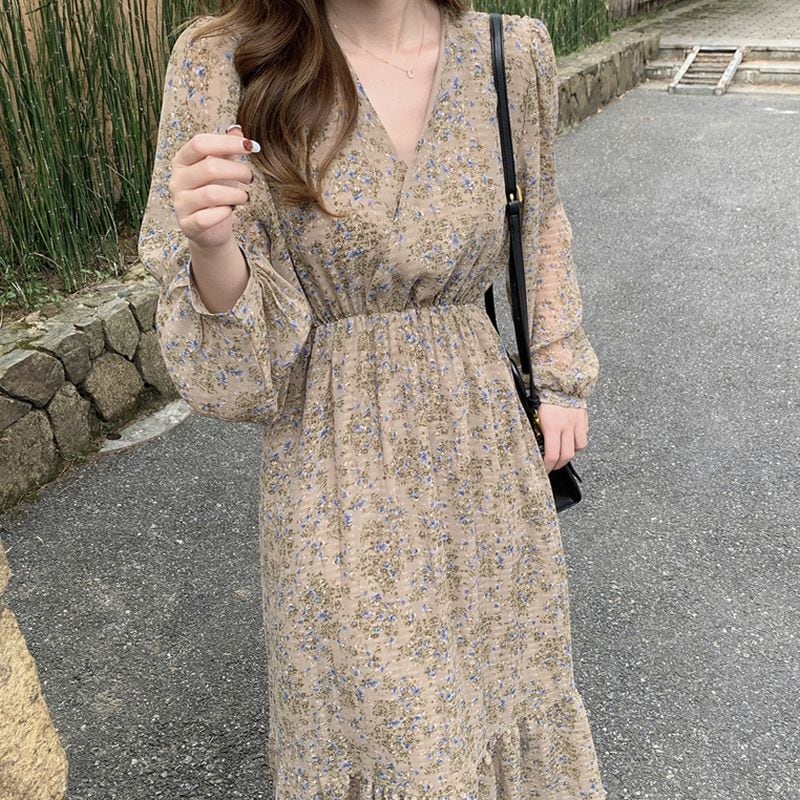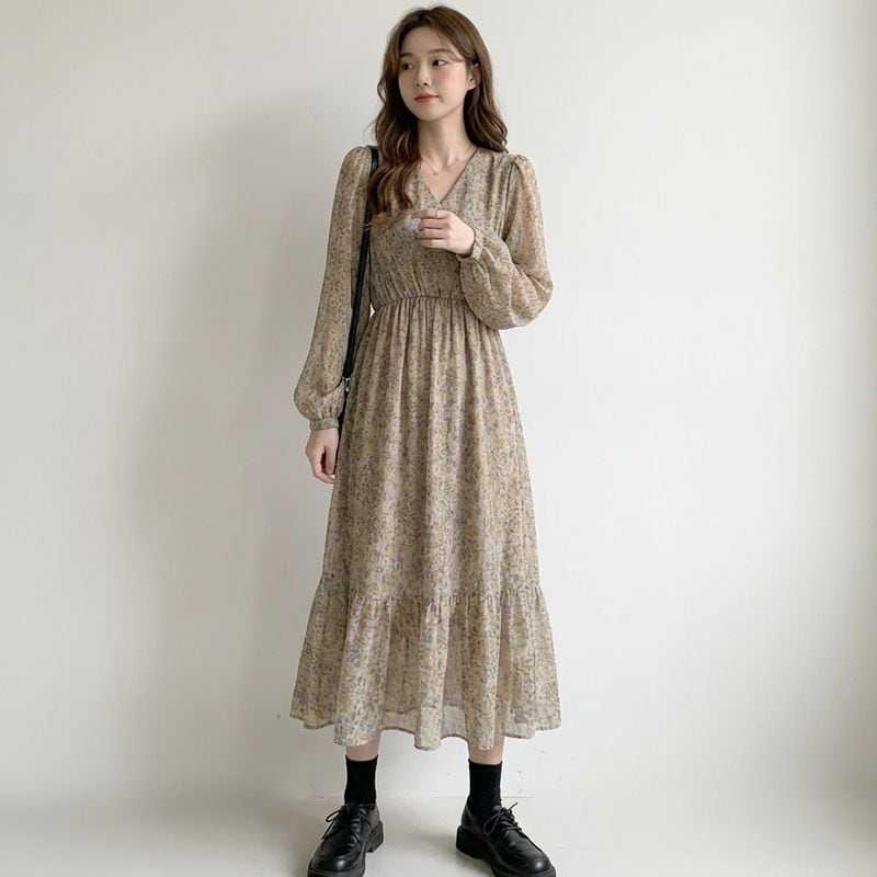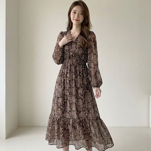 Vネックウエストギャザー小花柄ティアードワンピース L1042