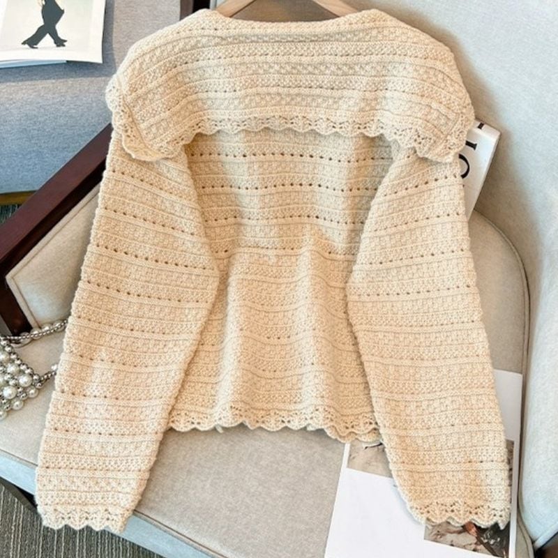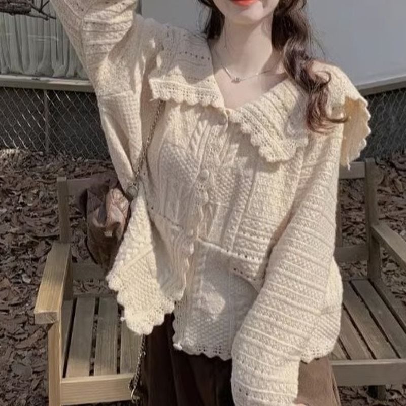 フリルカラーレース編みニットカーディガン L1044