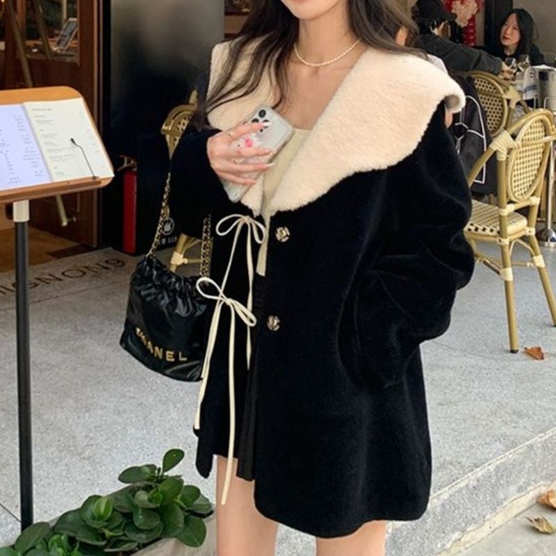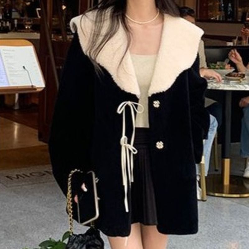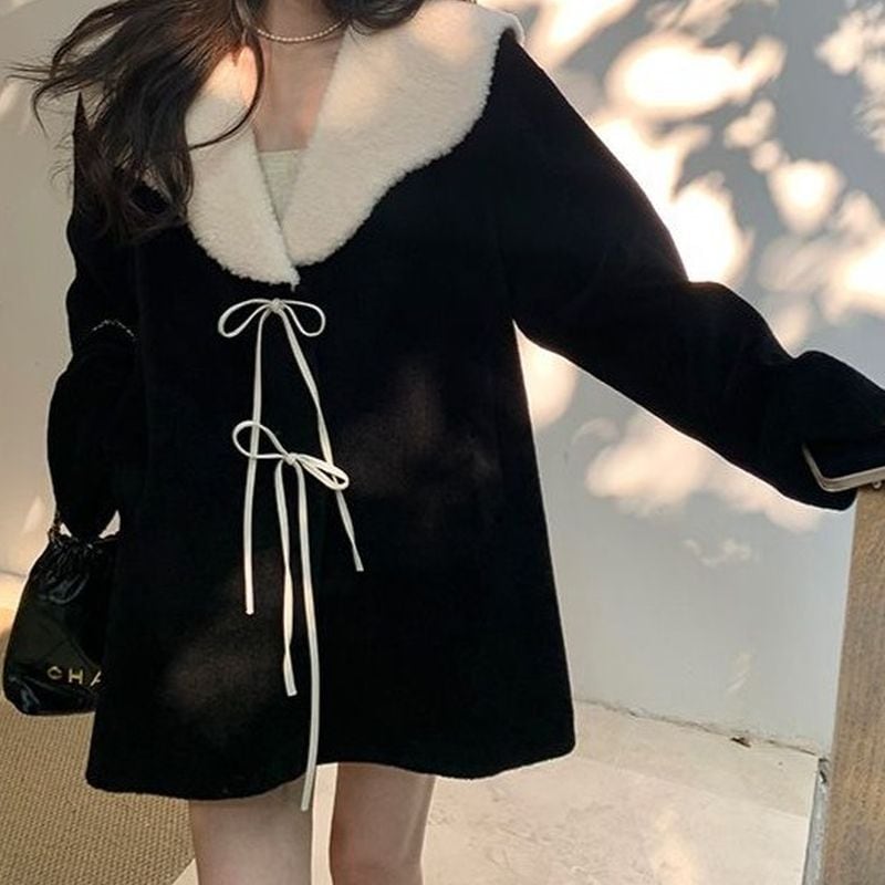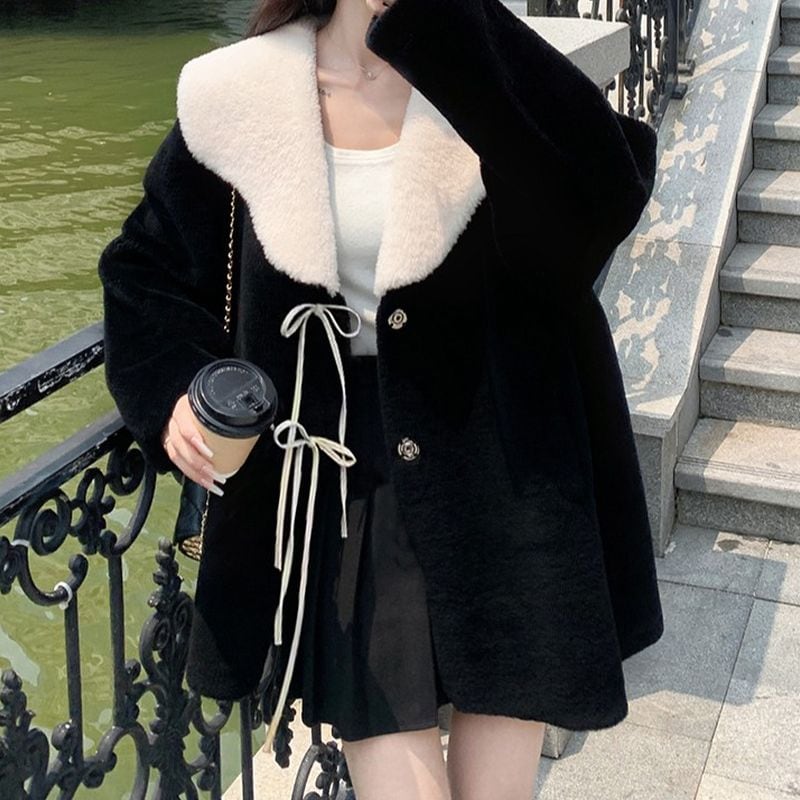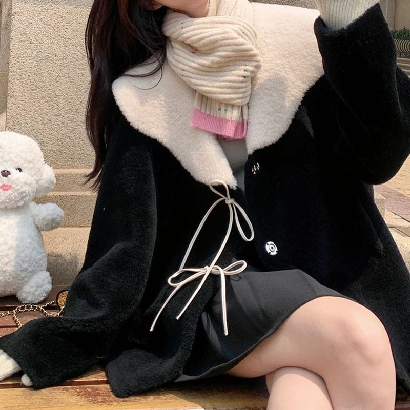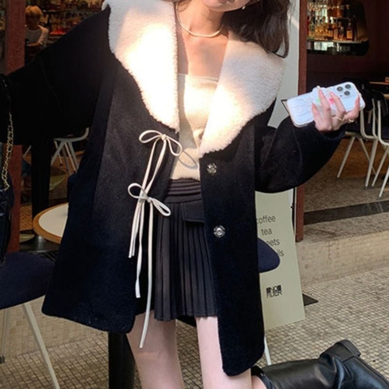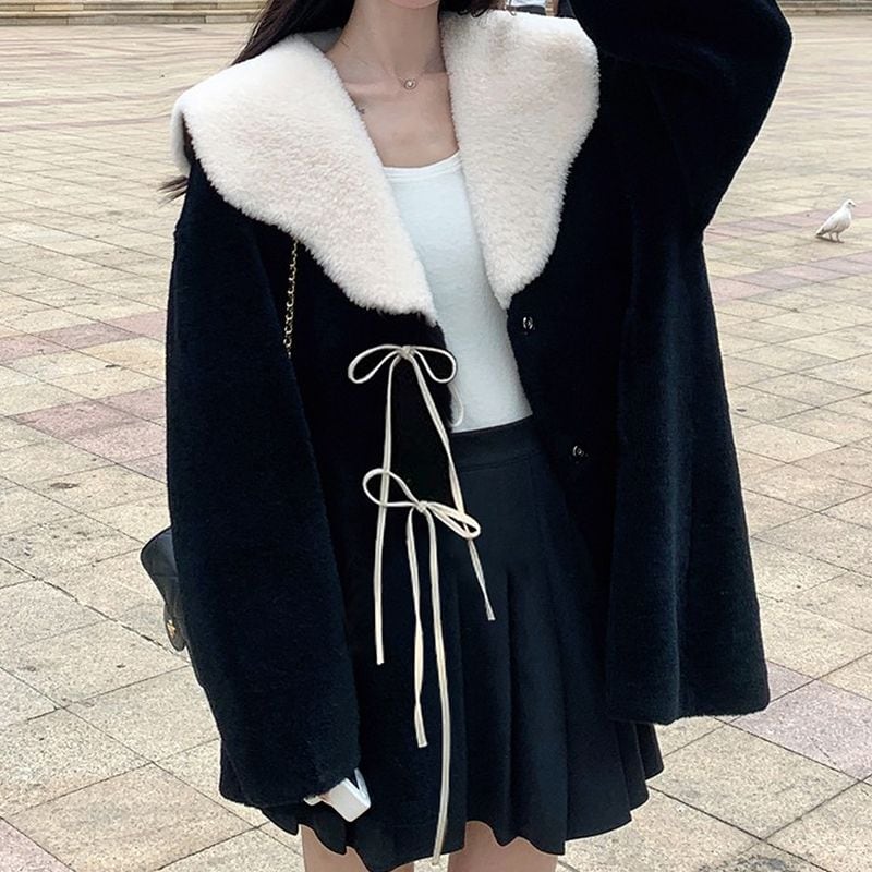 ふんわりとした襟のボア素材に、大きめのリボンが目を引くショートジャケット。