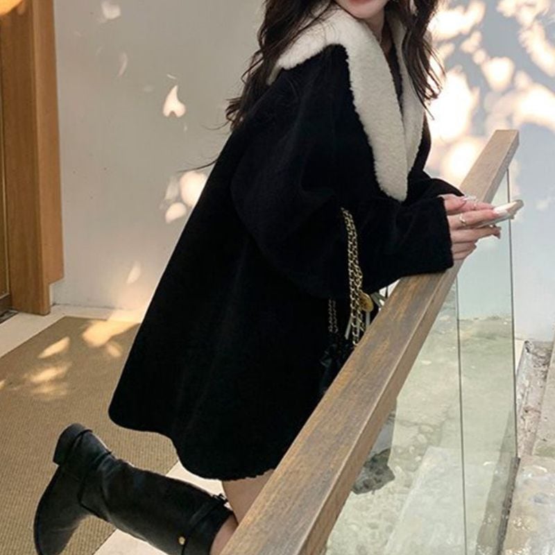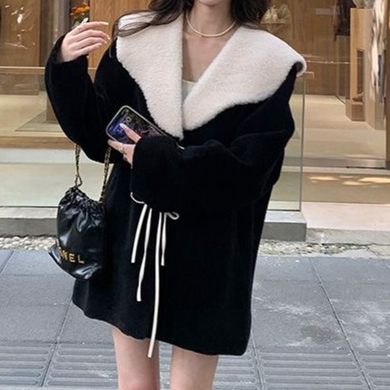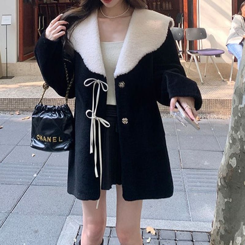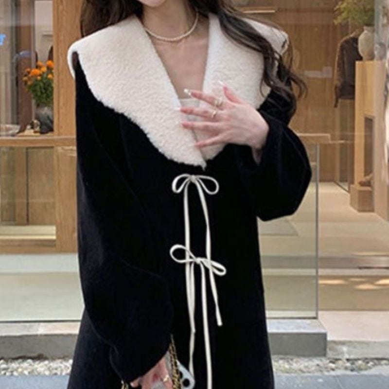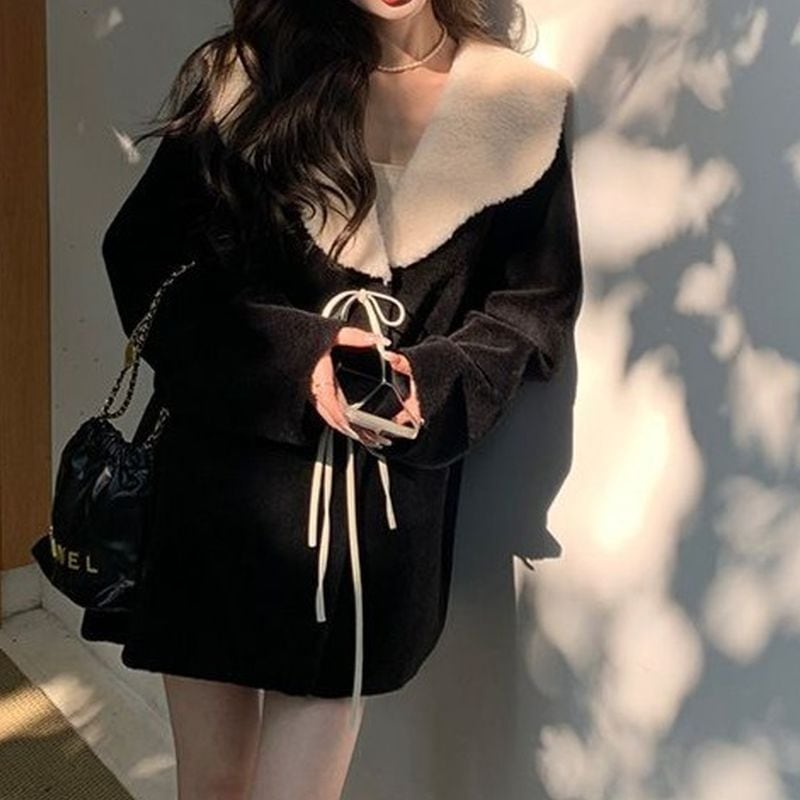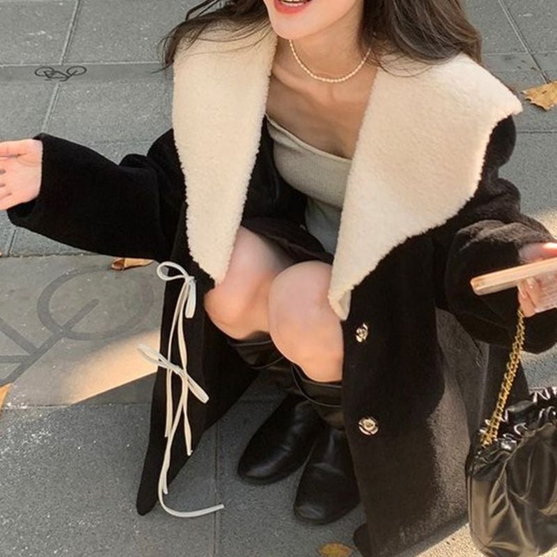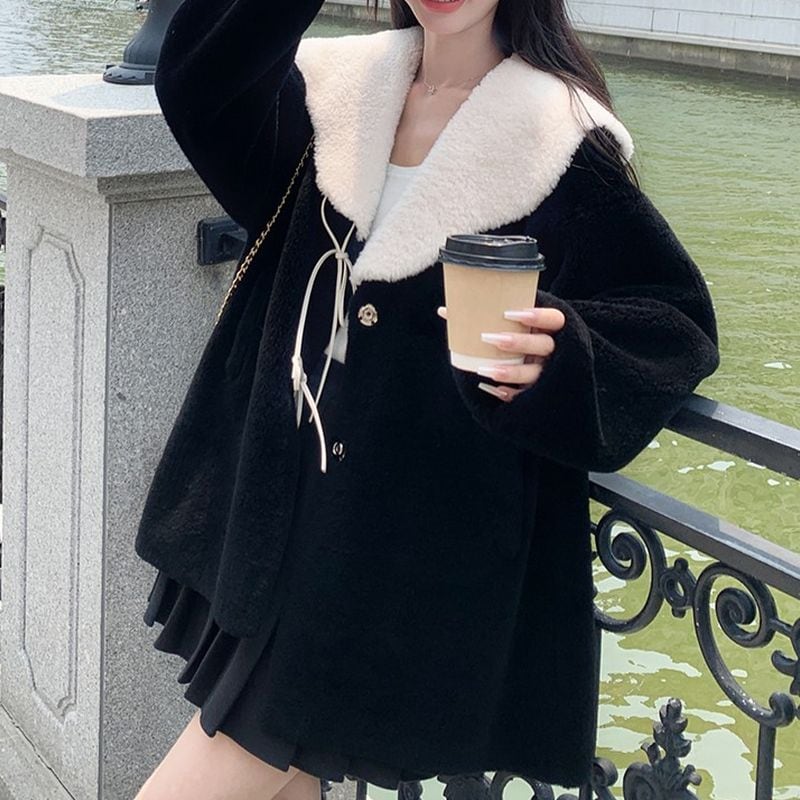 ふんわりとした襟のボア素材に、大きめのリボンが目を引くショートジャケット。