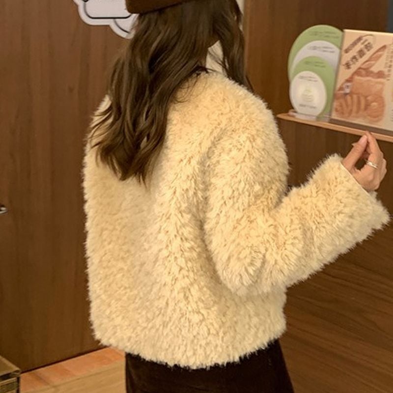 ふんわり柔らかなボア素材で、着るだけで優しい印象に仕上がるノーカラーブルゾン。