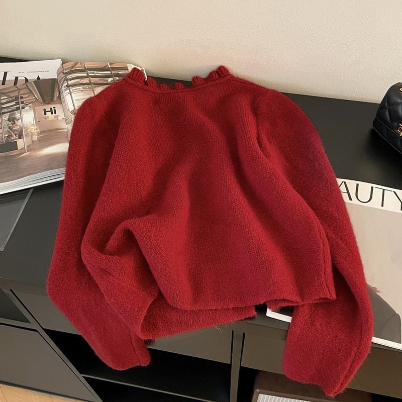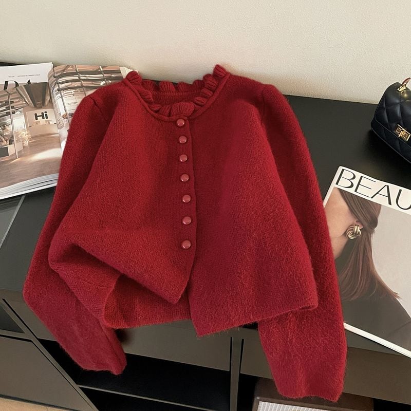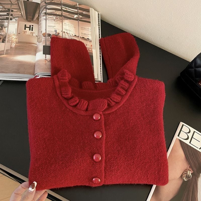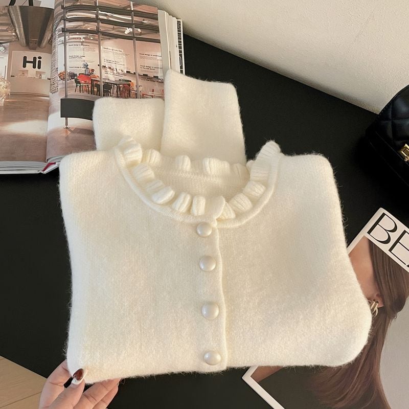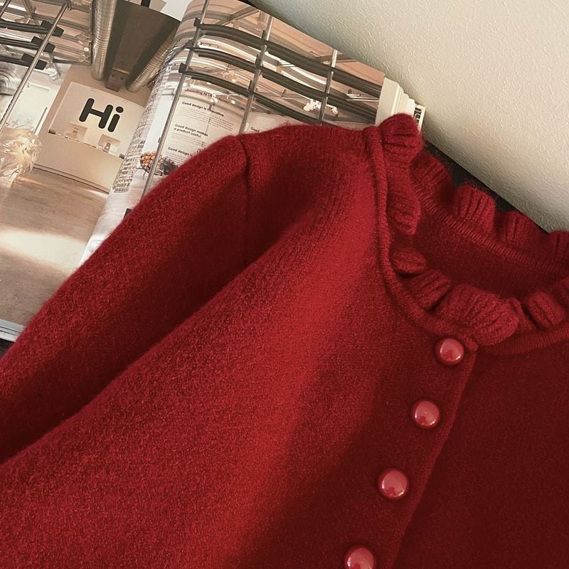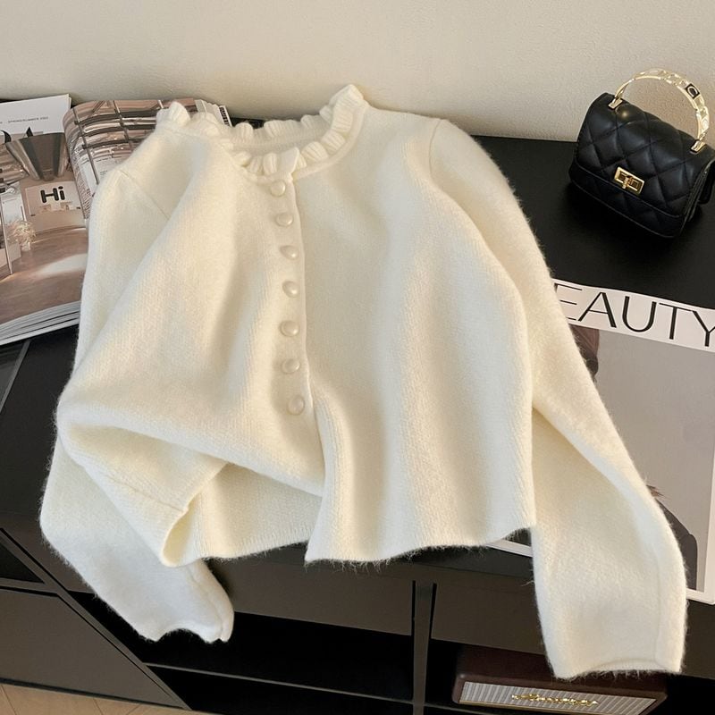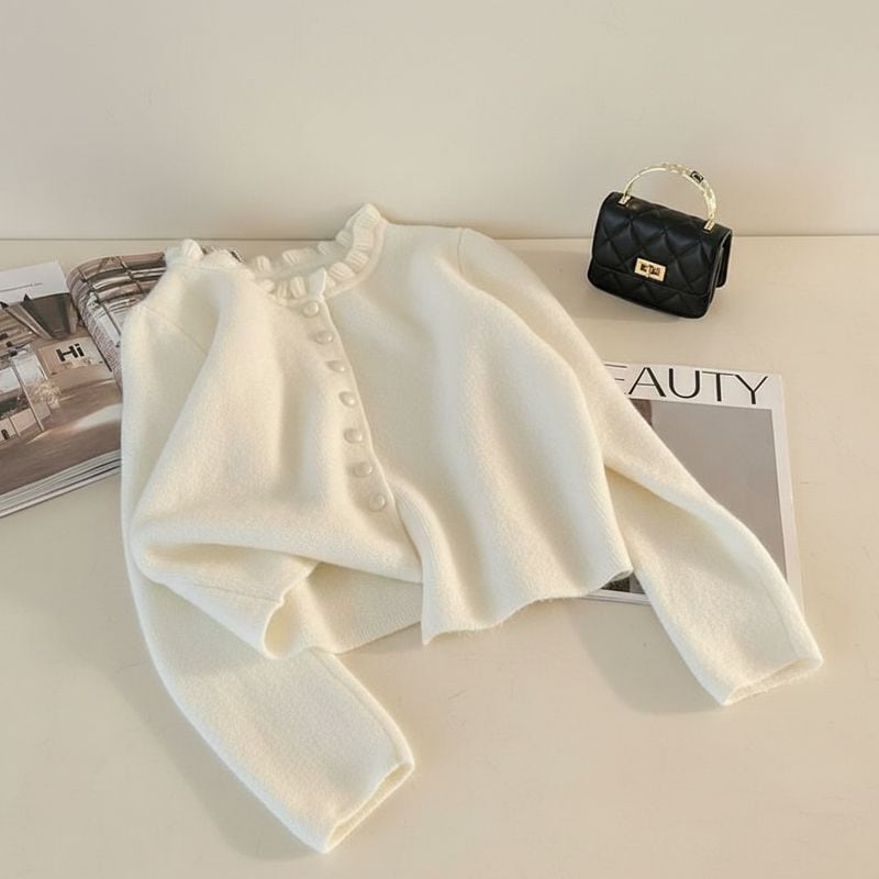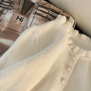 襟元のフリルが顔まわりを華やかに魅せる、フェミニンなニットカーディガン。
