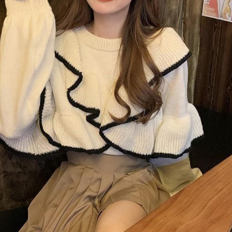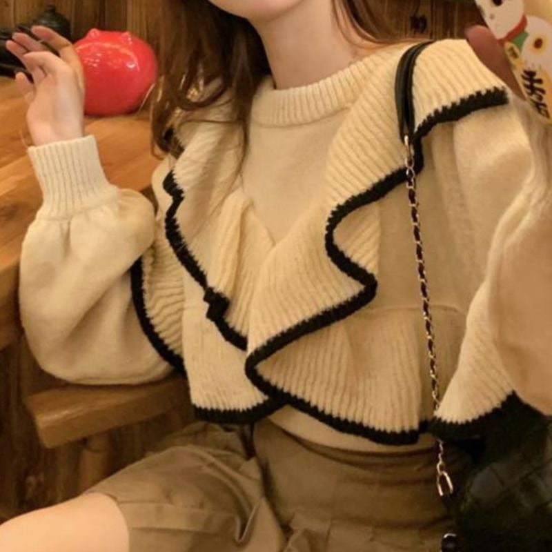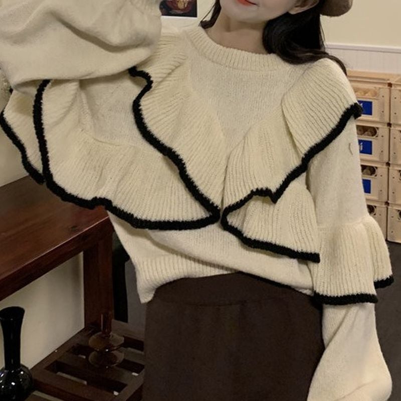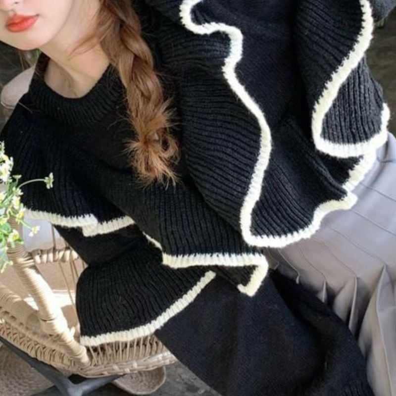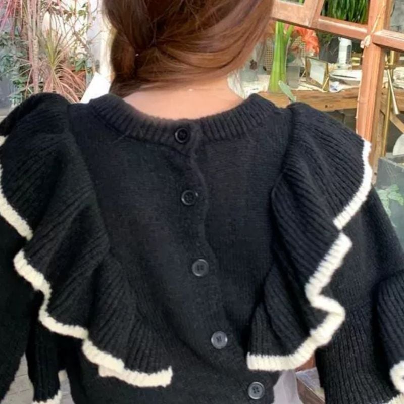 リバーシブルボタン&フリルパフスリーブニットトップス L1063