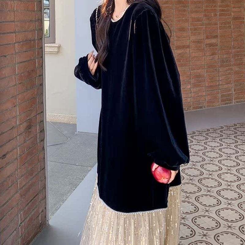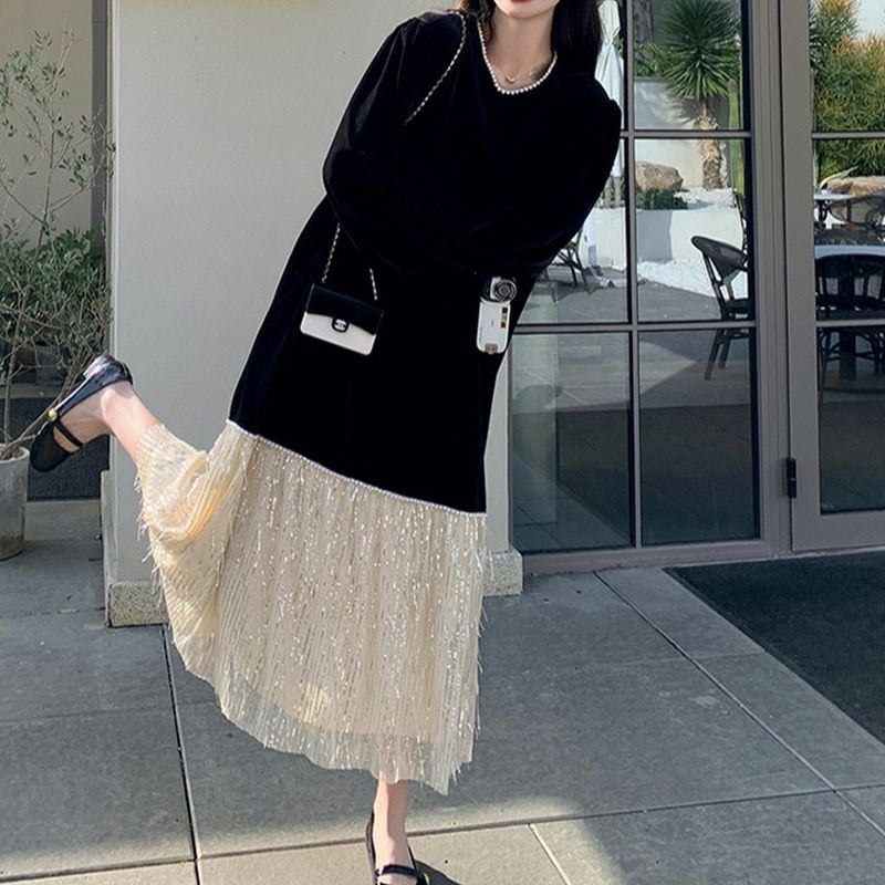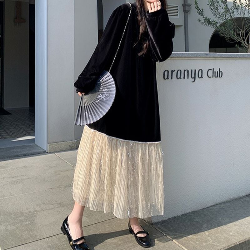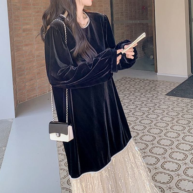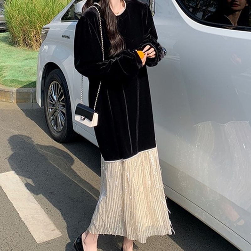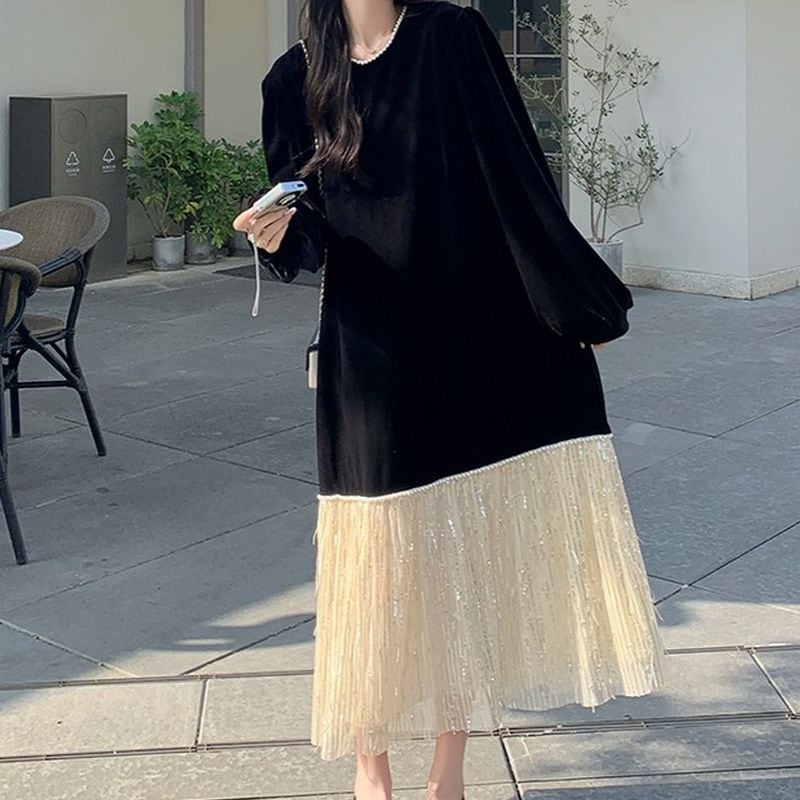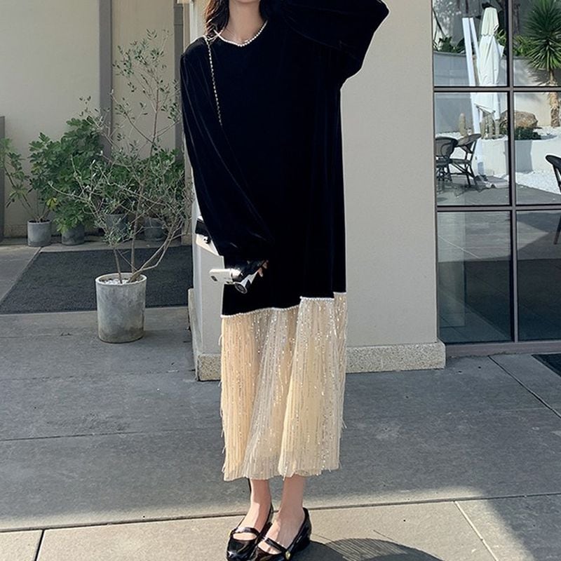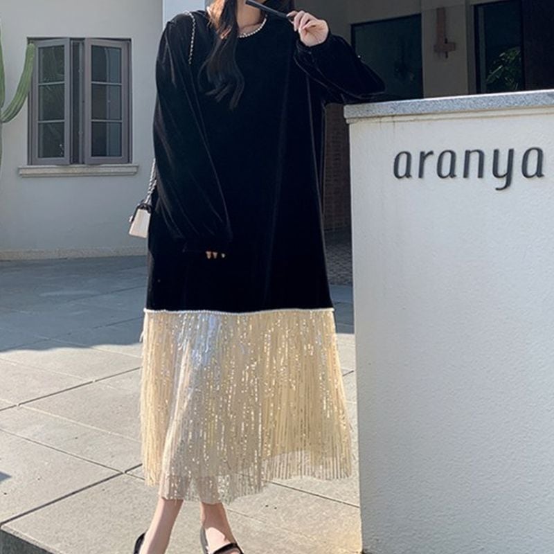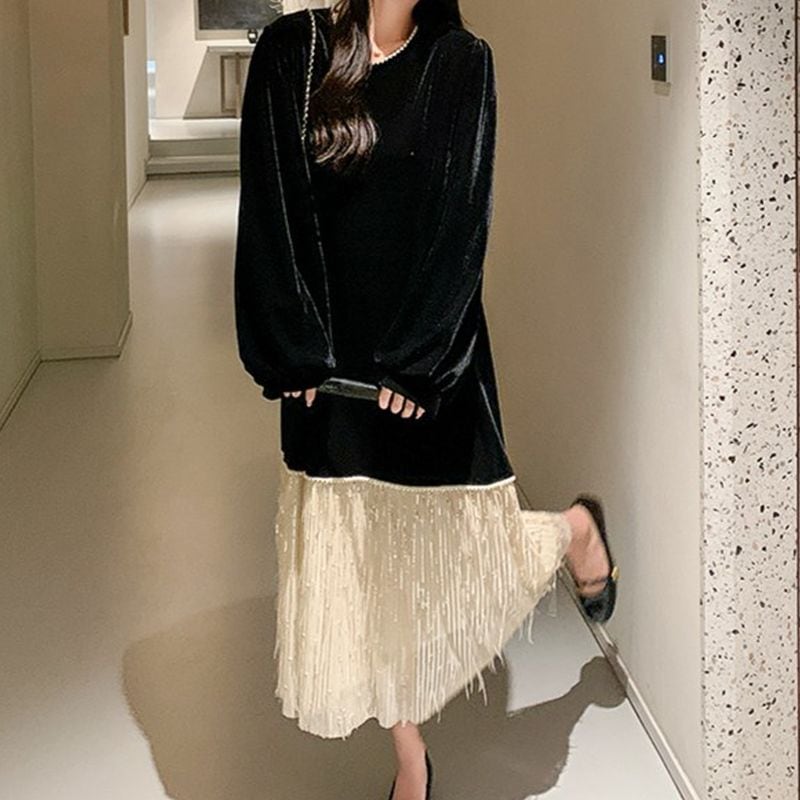 フリンジ切替えベロアワンピース L1071