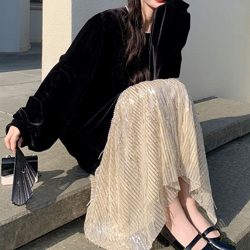 膝上あたりから異素材で切り替えたデザインは、立体感のあるフリンジが動くたびに表情を変え、