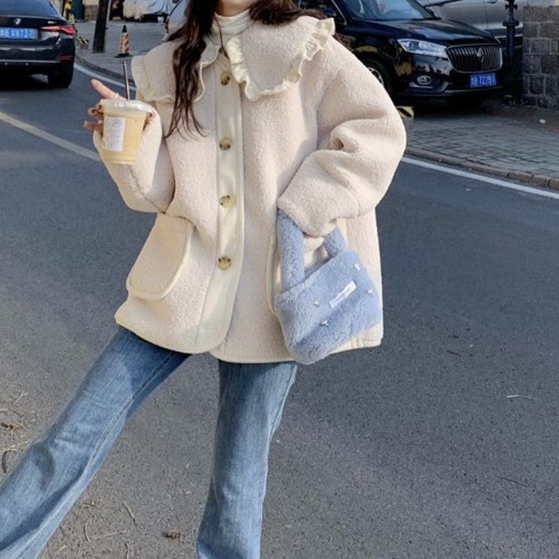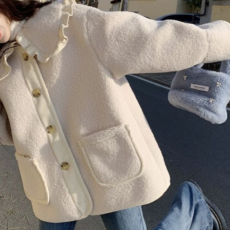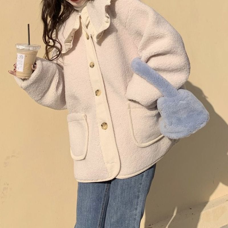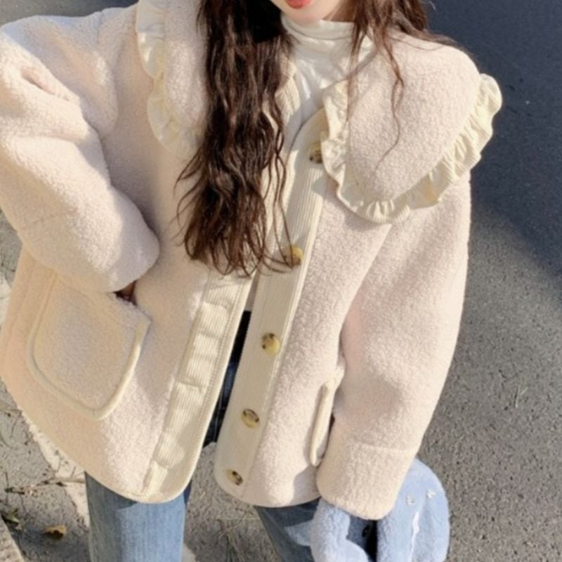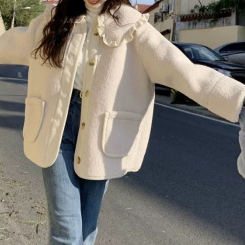 フリルカラーをあしらった大人可愛いボアブルゾン。