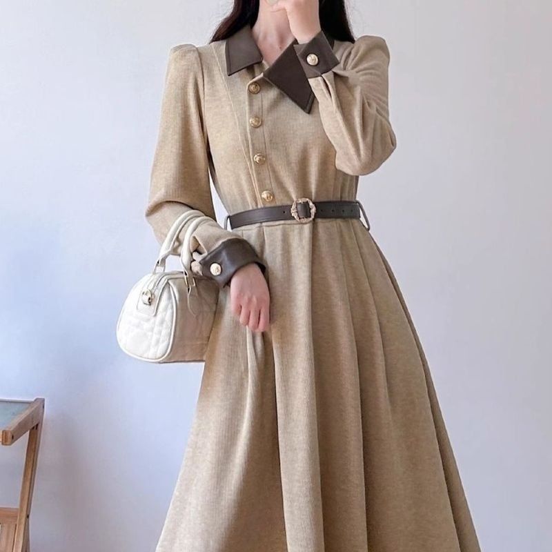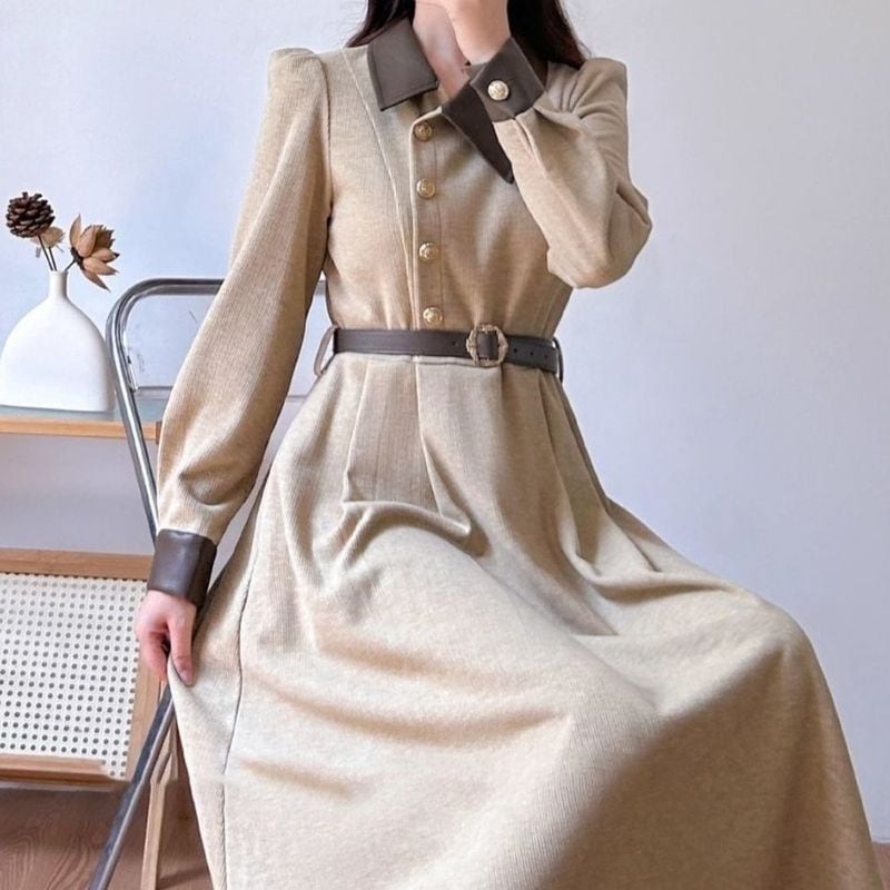 上品なフレアシルエットにクラシックな雰囲気を添えたベルト付きワンピース。