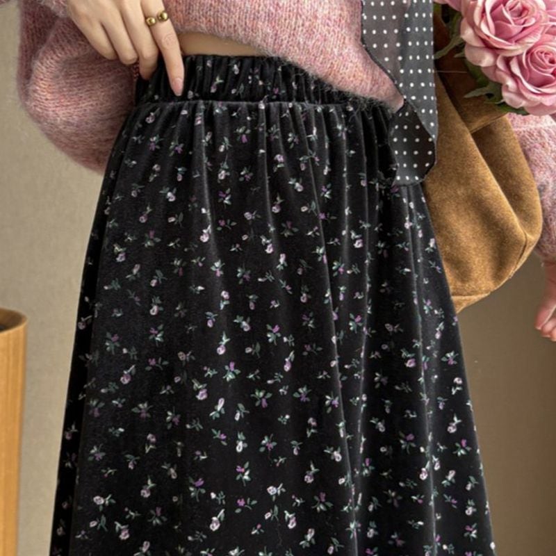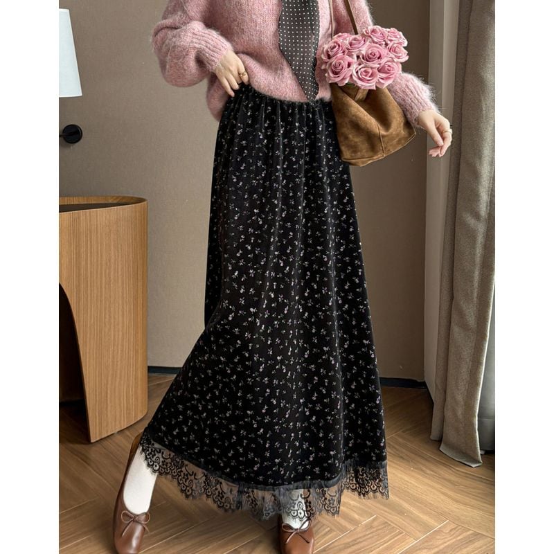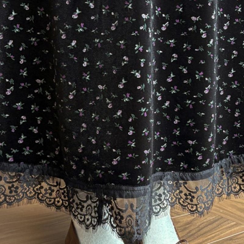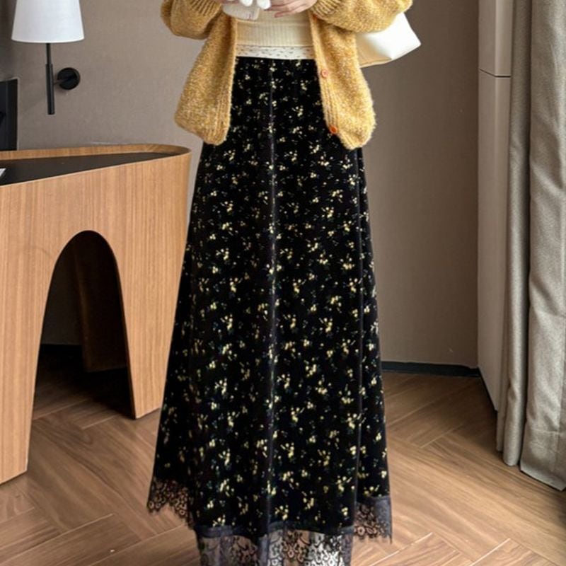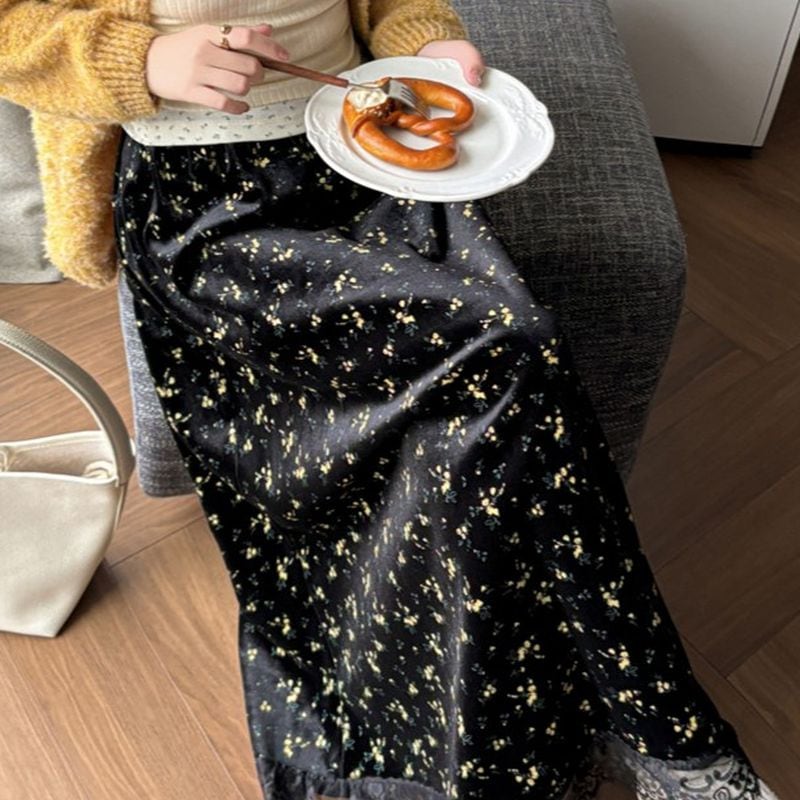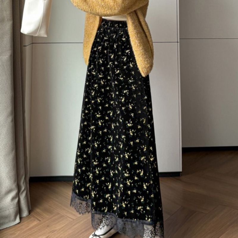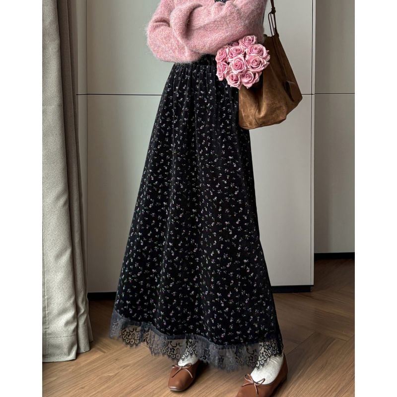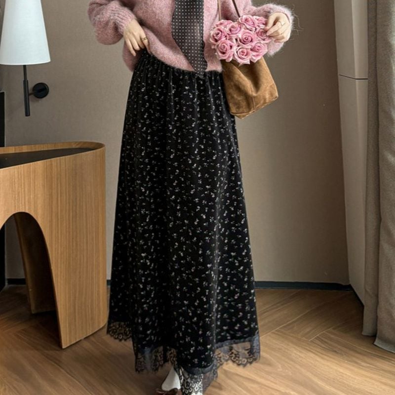 繊細なレースと上品な花柄を組み合わせた、大人可愛いムード漂うスカート。