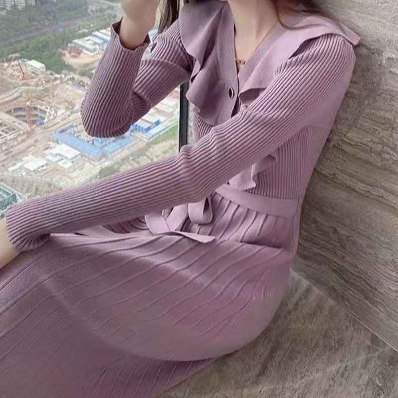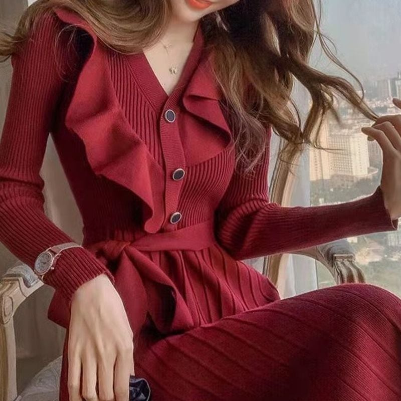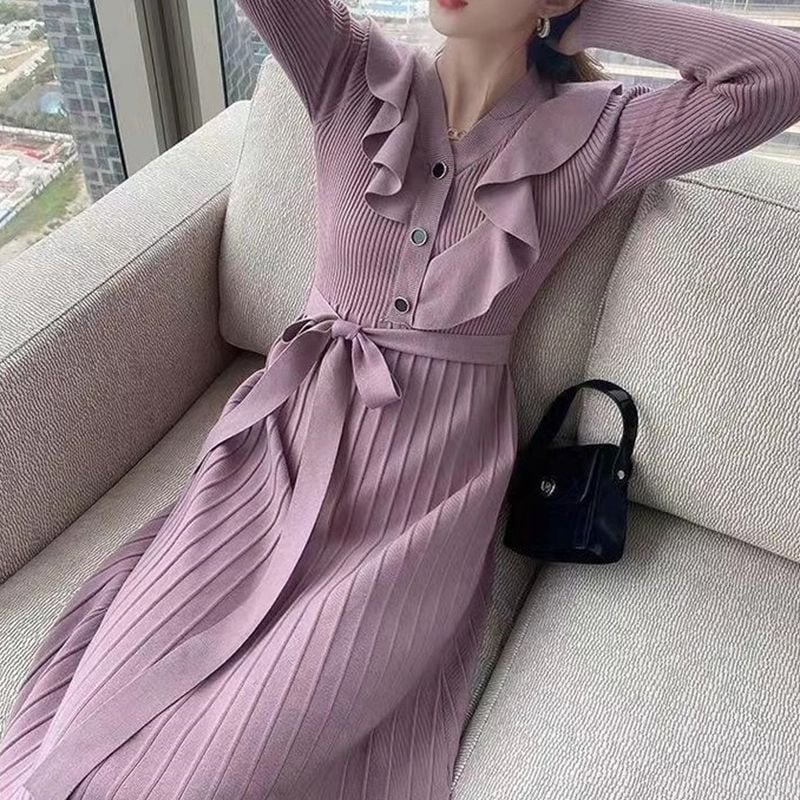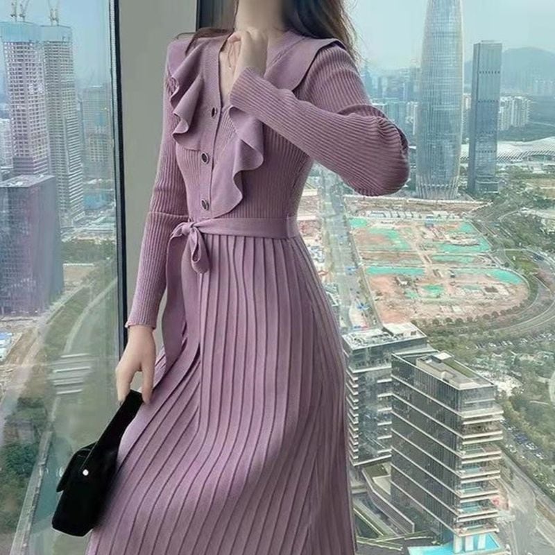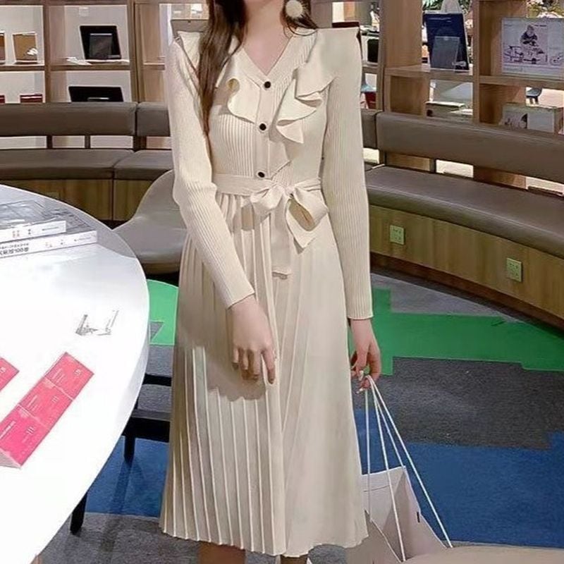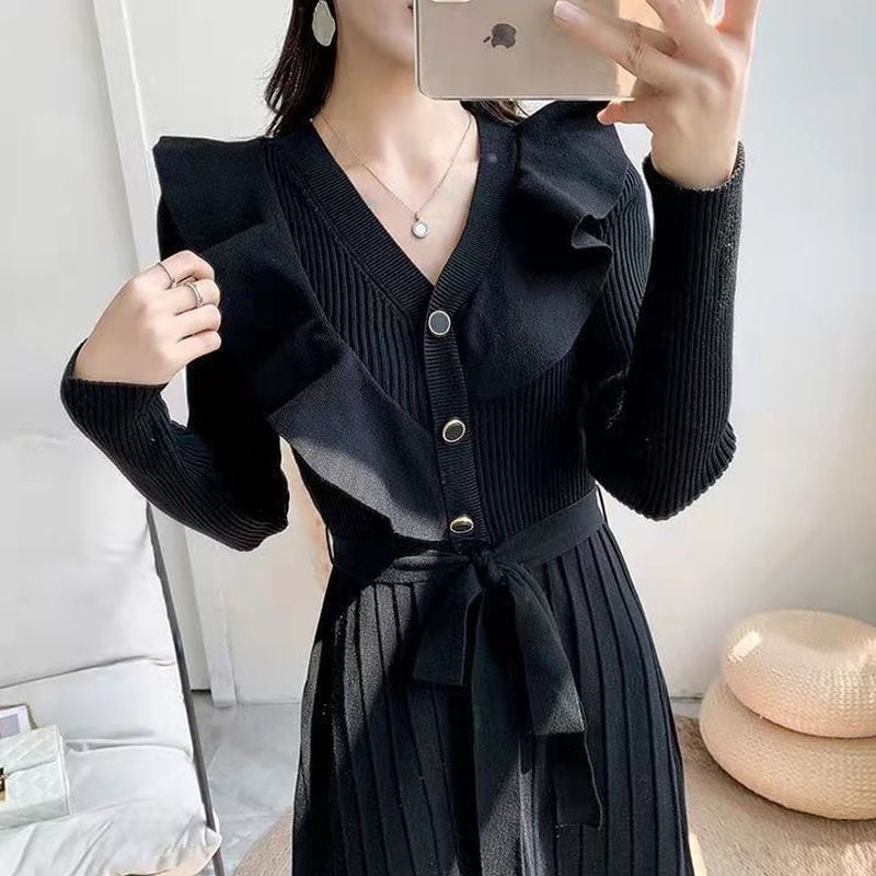 女性らしさを引き立てるフリルデザインと、すっきりとしたVネックが魅力のミモレ丈ワンピース。