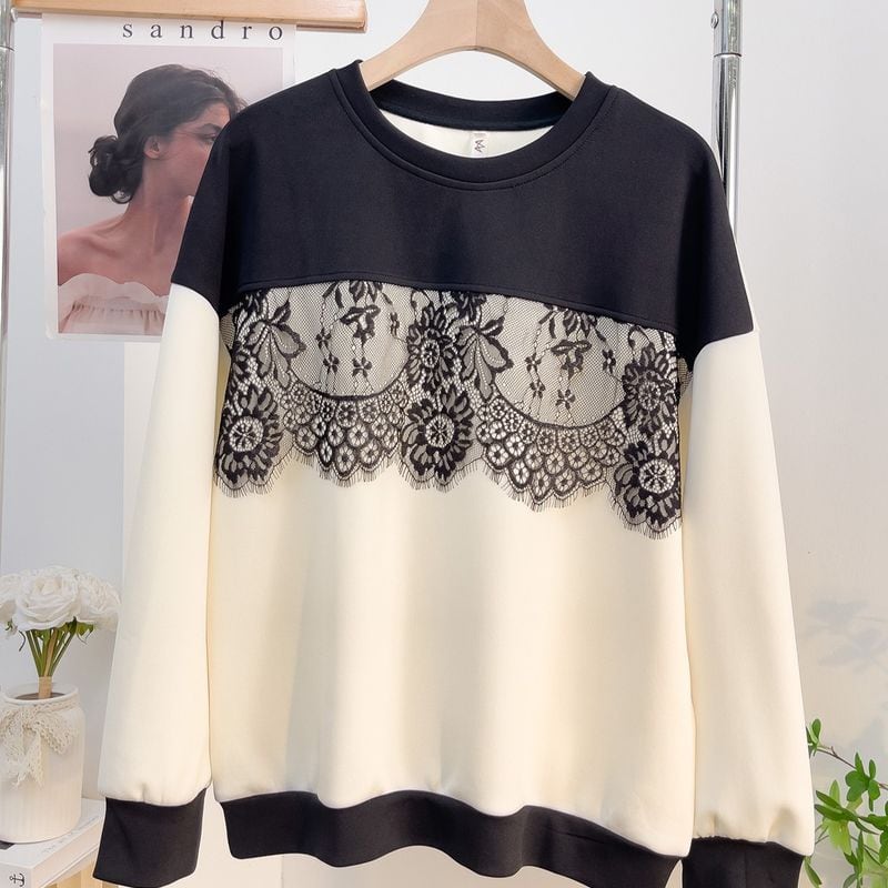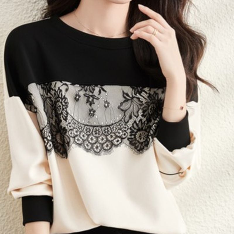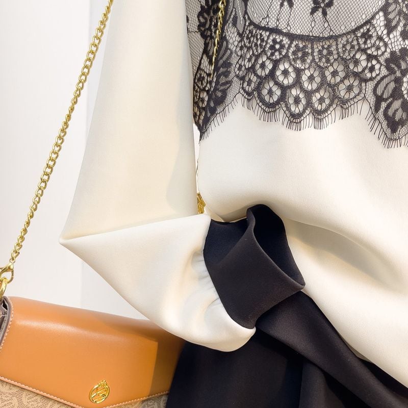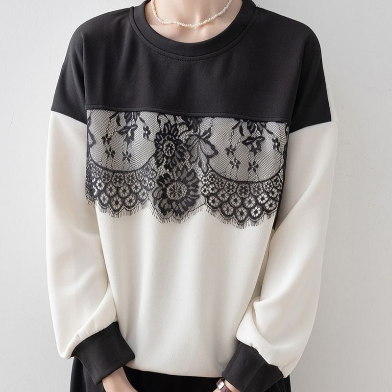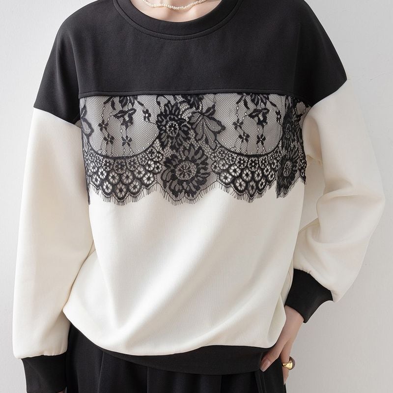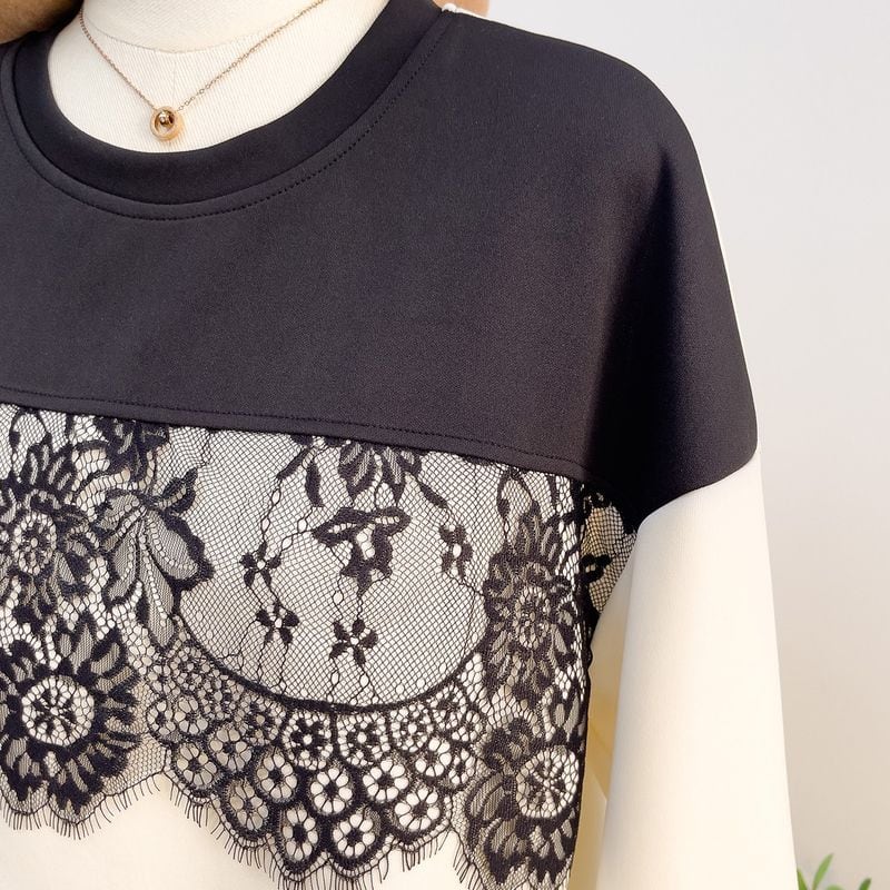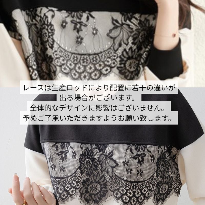 繊細なレースデザインが目を引く、上品なバイカラートップス。