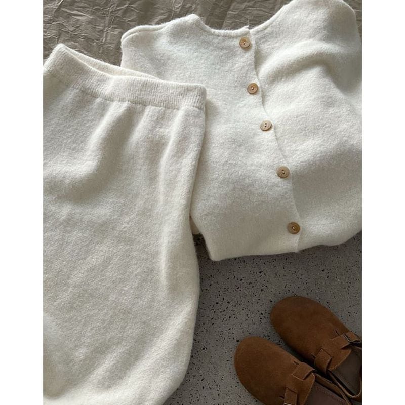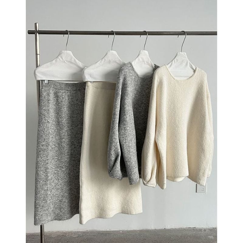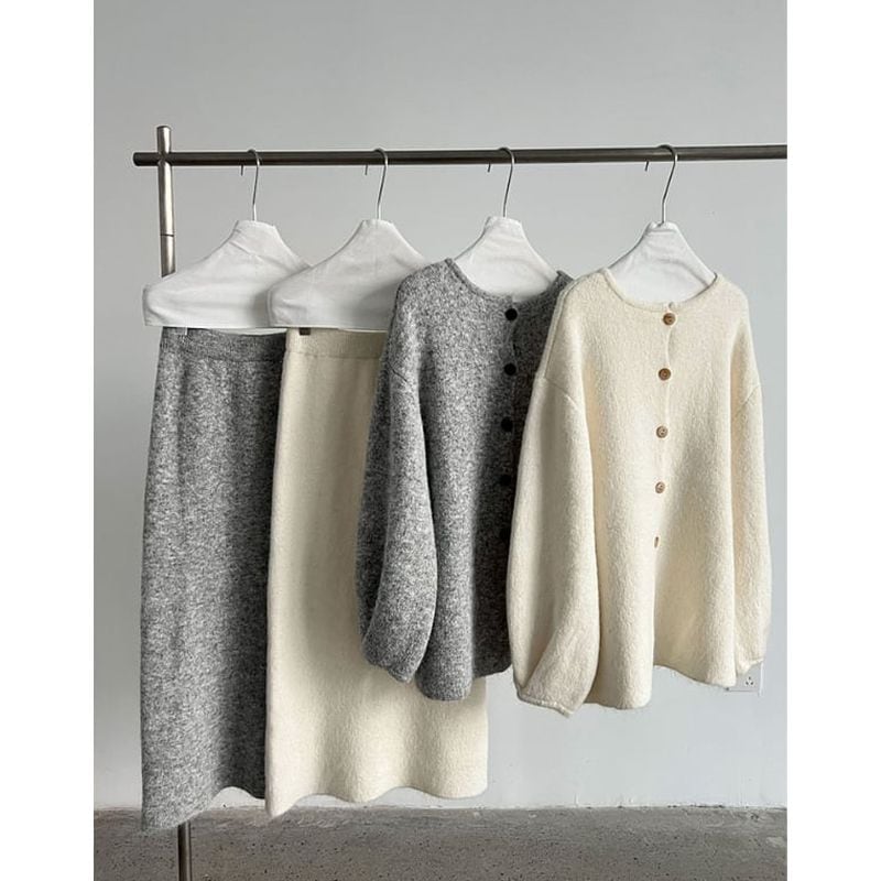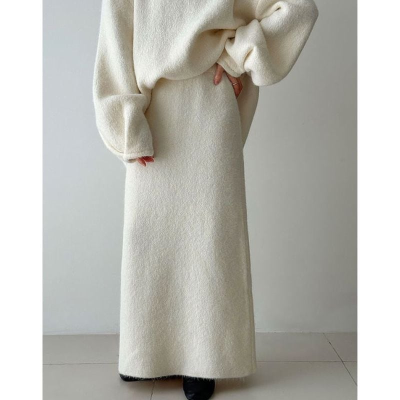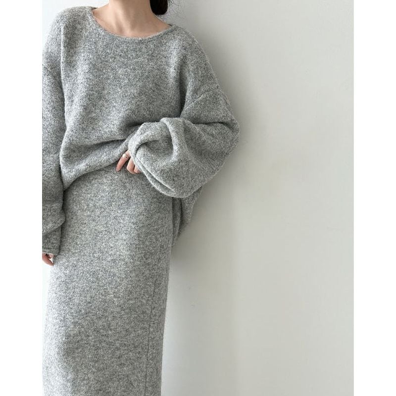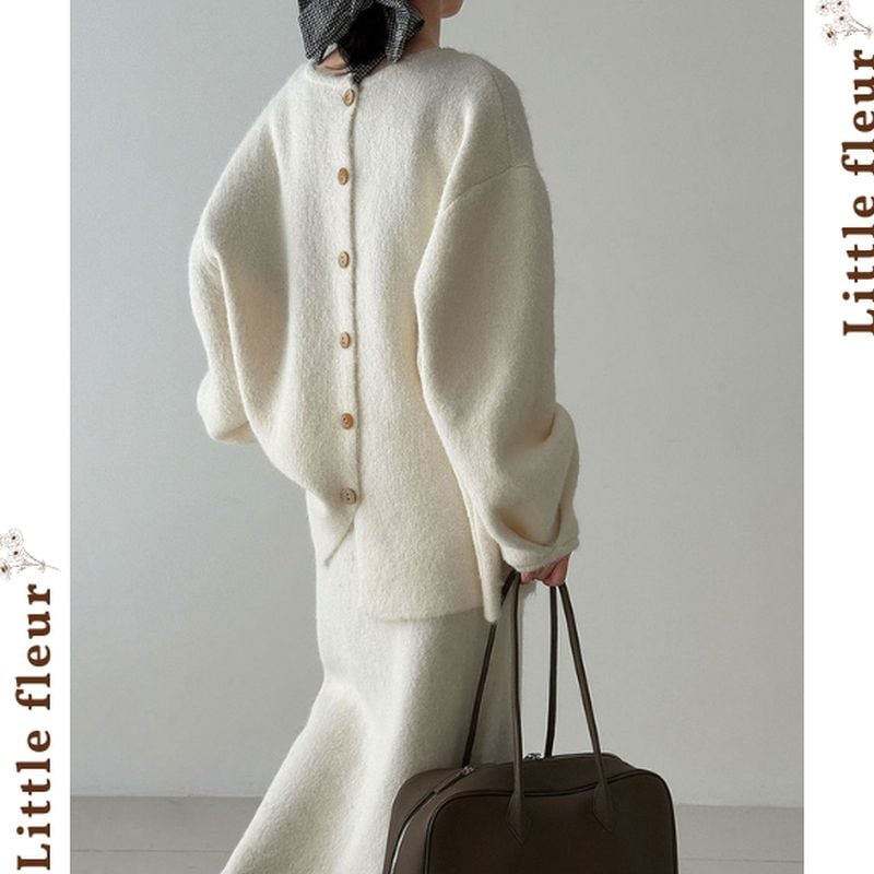 バックボタンが印象的なニットトップスと、上品に揺れるスカートを組み合わせた大人フェミニンな2点セット。