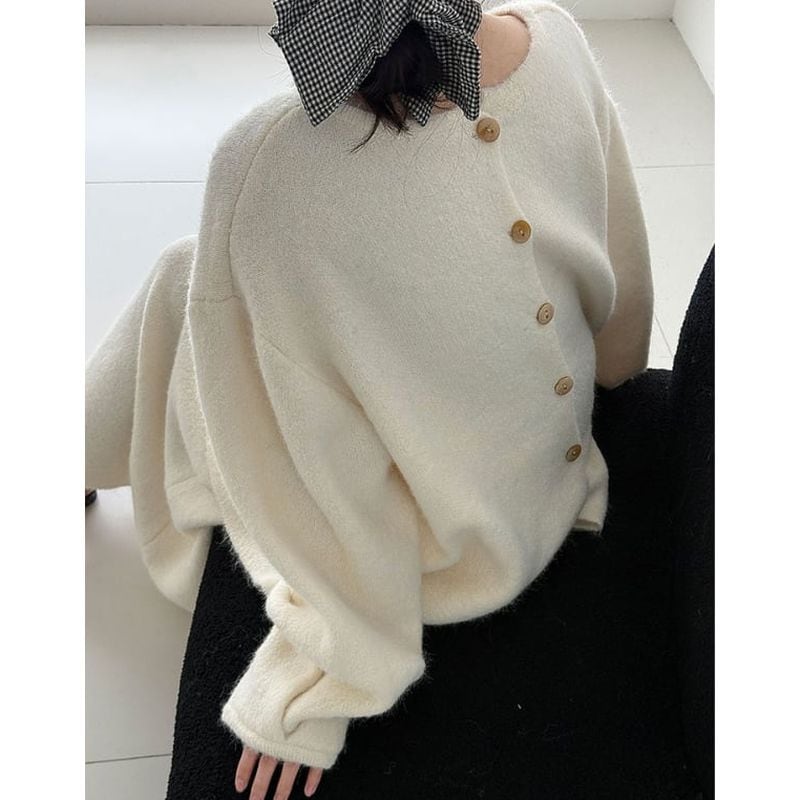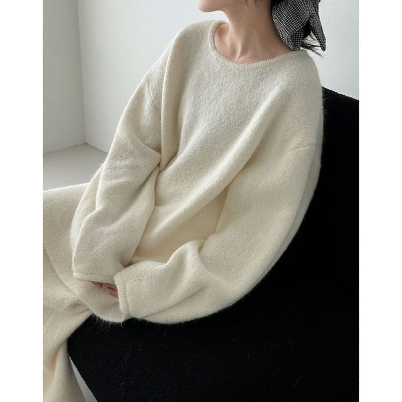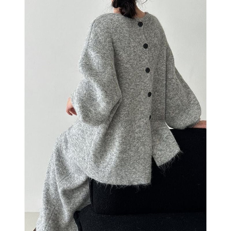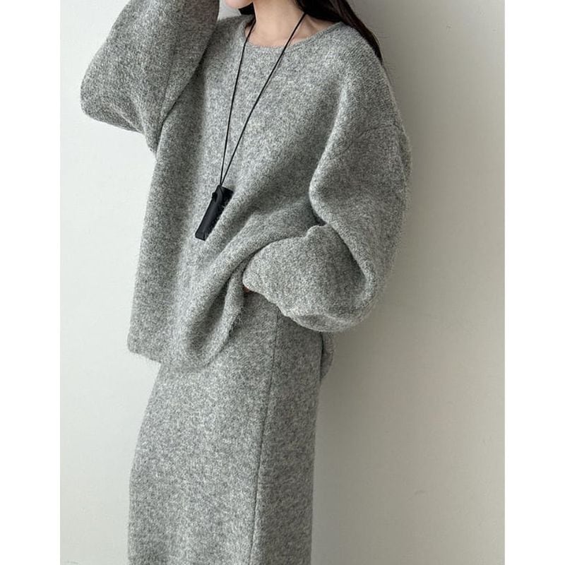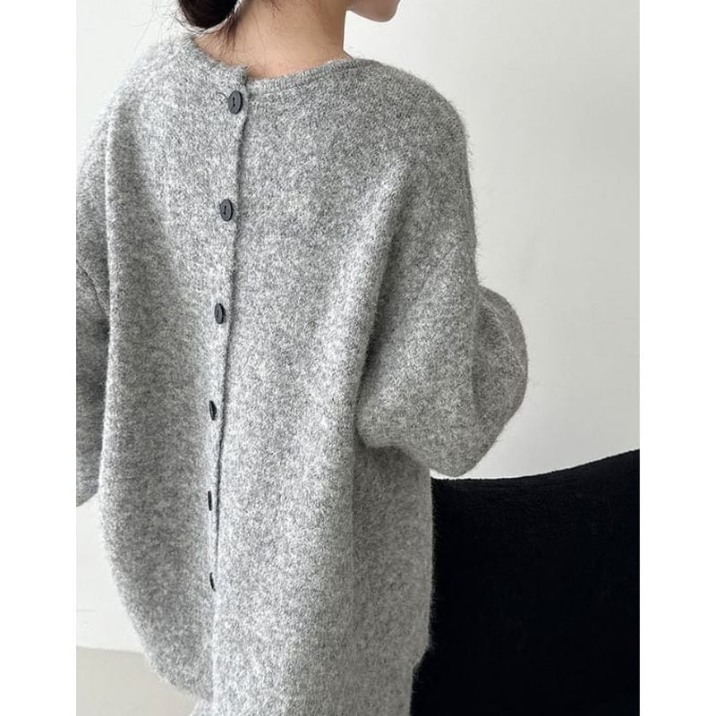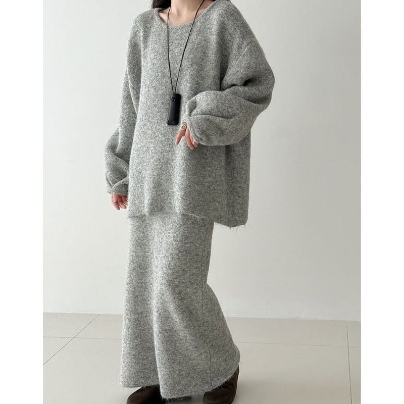 バックボタンが印象的なニットトップスと、上品に揺れるスカートを組み合わせた大人フェミニンな2点セット。
