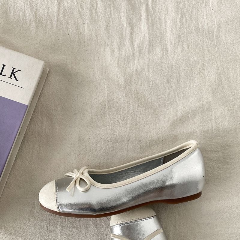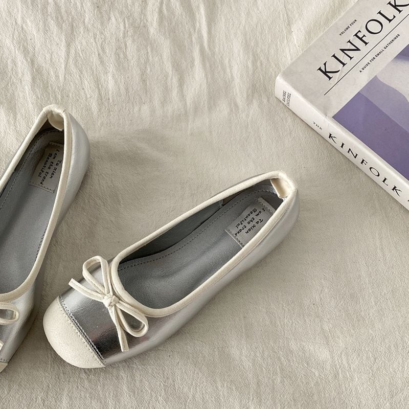 スクエアトゥのすっきりとしたフォルムに、バイカラーのアクセントと細リボンを添えた上品フラットシューズ。甘すぎず洗練されたデザインで、大人可愛いスタイルにぴったりの一足です。