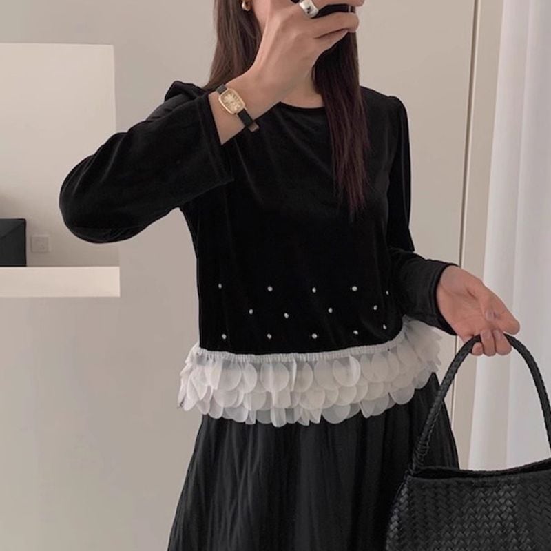 上品な光沢を放つベルベット素材にウエストラインのフリンジ切替えを加えたフェミニントップス。シンプルになりがちな冬のスタイルに奥行きと表情を与え、1枚で華やぐデザインです。