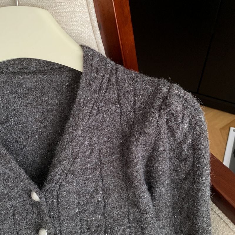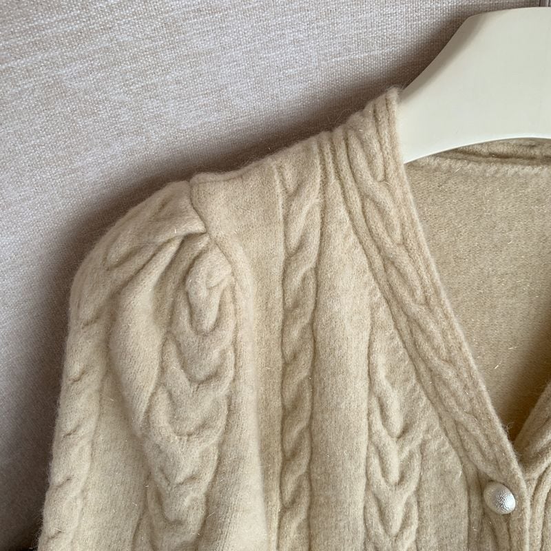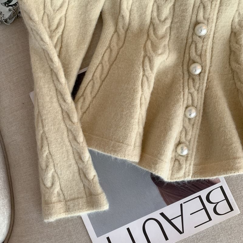 フロントボタンデザインと、ふんわり広がるペプラムシルエットが女性らしさを引き立てるカーディガン。