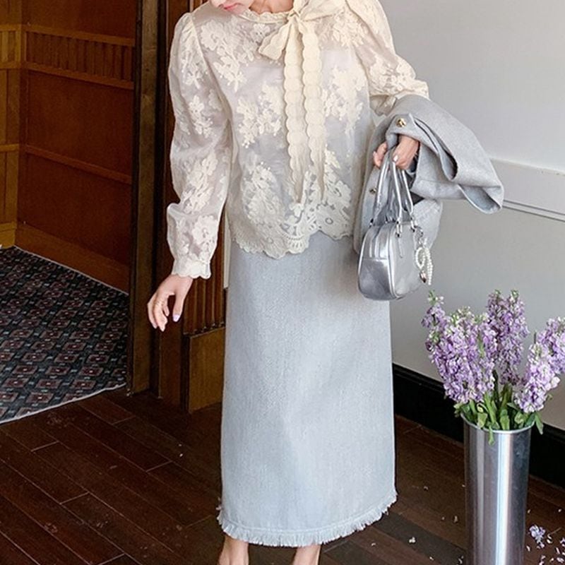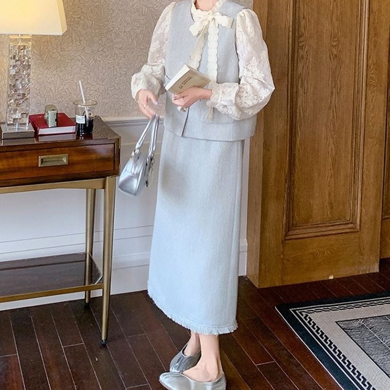 ふんわり透け感のあるボウタイブラウスが顔まわりをやさしく彩り、ベストを重ねることでコーデにきちんと感をプラス。裾のシャギーデザインが印象的なスカートは、歩くたびに表情を生み、女性らしい雰囲気を引き立てます。