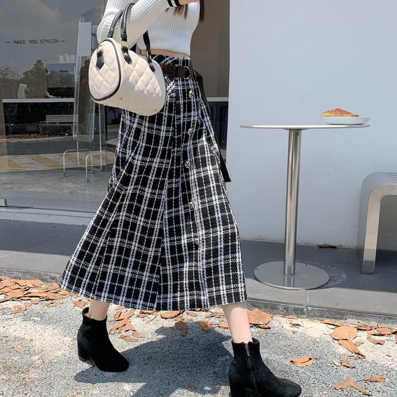 チェックツイードビジューボタンフレアスカート L1119