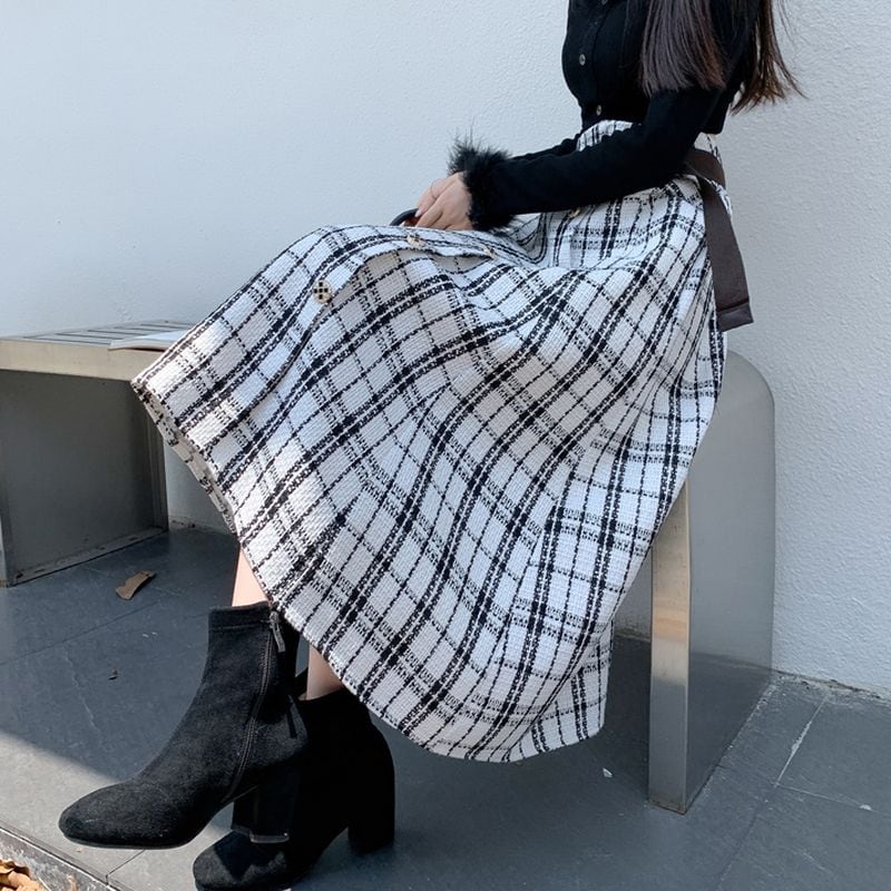 クラシカルなチェック柄ツイードを使用した、上品さ漂うフレアスカート。