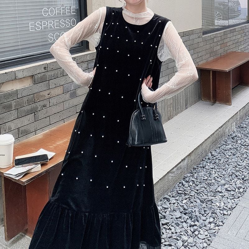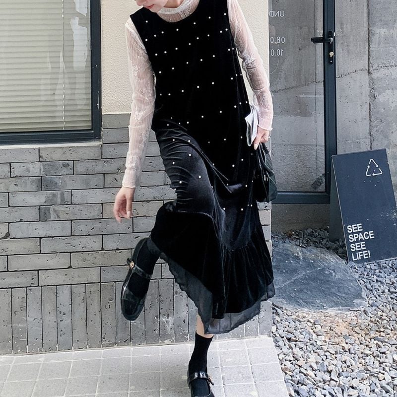 上品な光沢感のあるベロアワンピースに、繊細なハイネックシアートップスを合わせた華やかな2点セット。ワンピースにあしらわれたパールディテールが、さりげなく女性らしさと特別感を演出します。落ち着いたベロア素材で、大人っぽく上品な印象に。