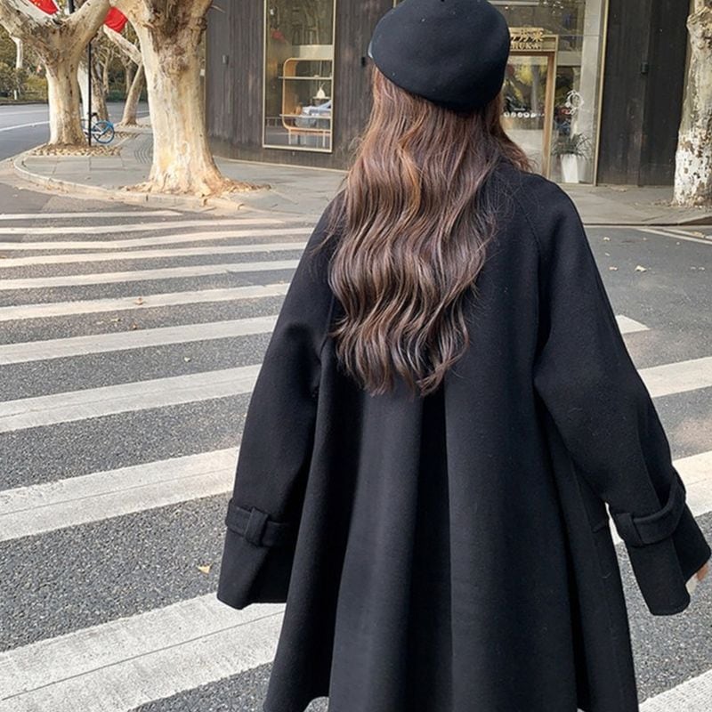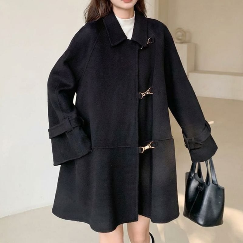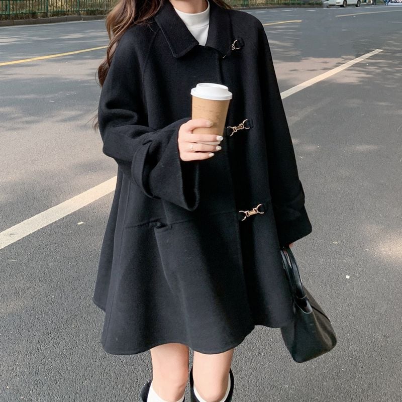 上品なゴールドフックがさりげなく映える、Aラインシルエットのミディ丈コート。