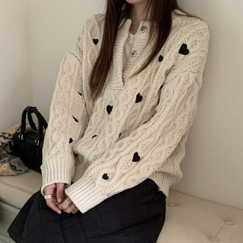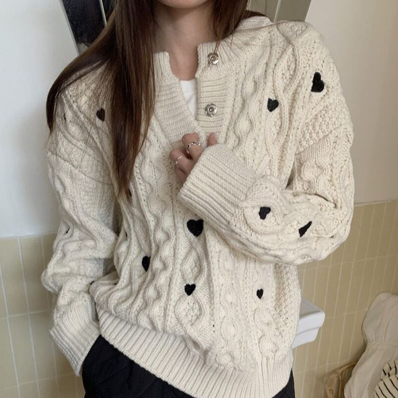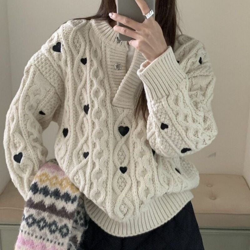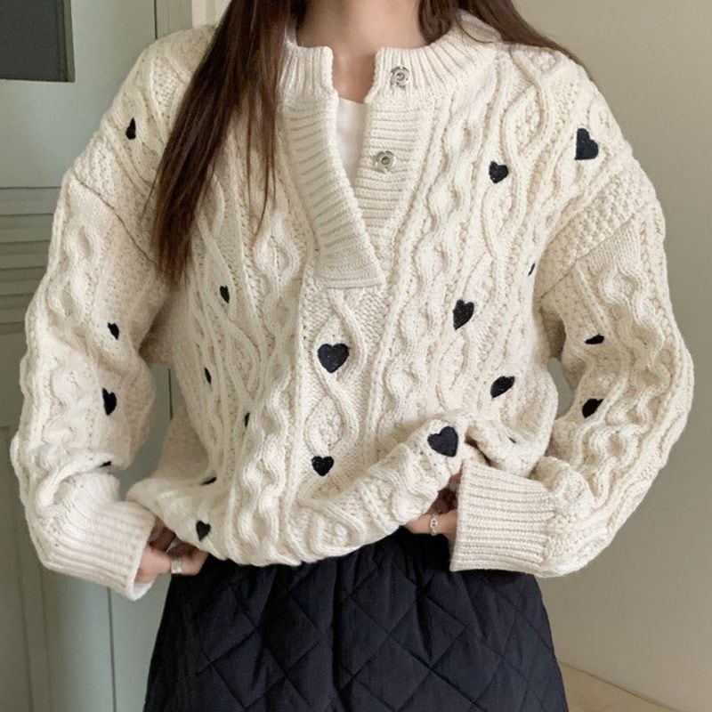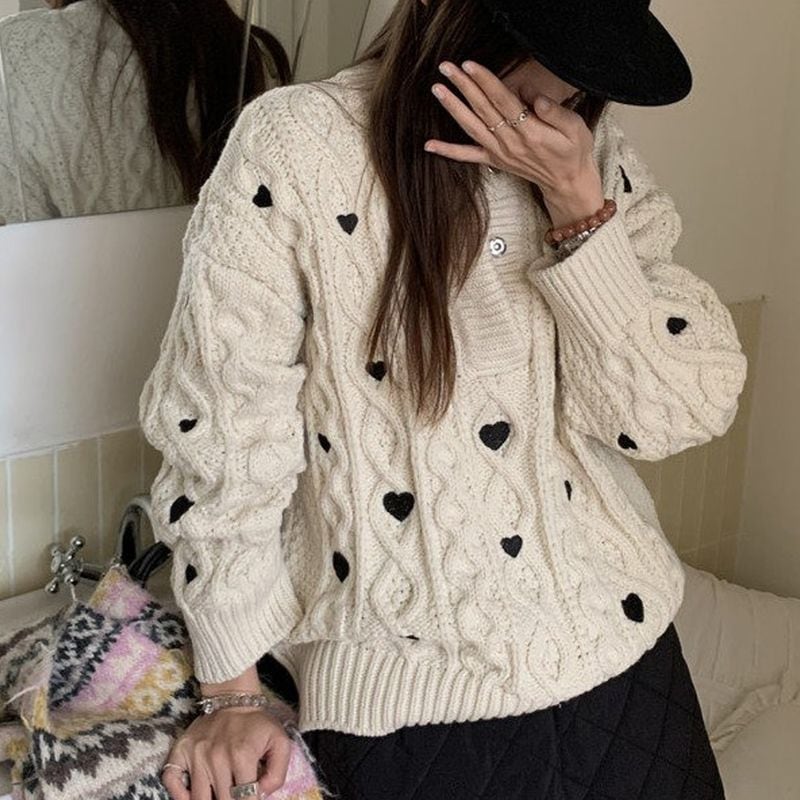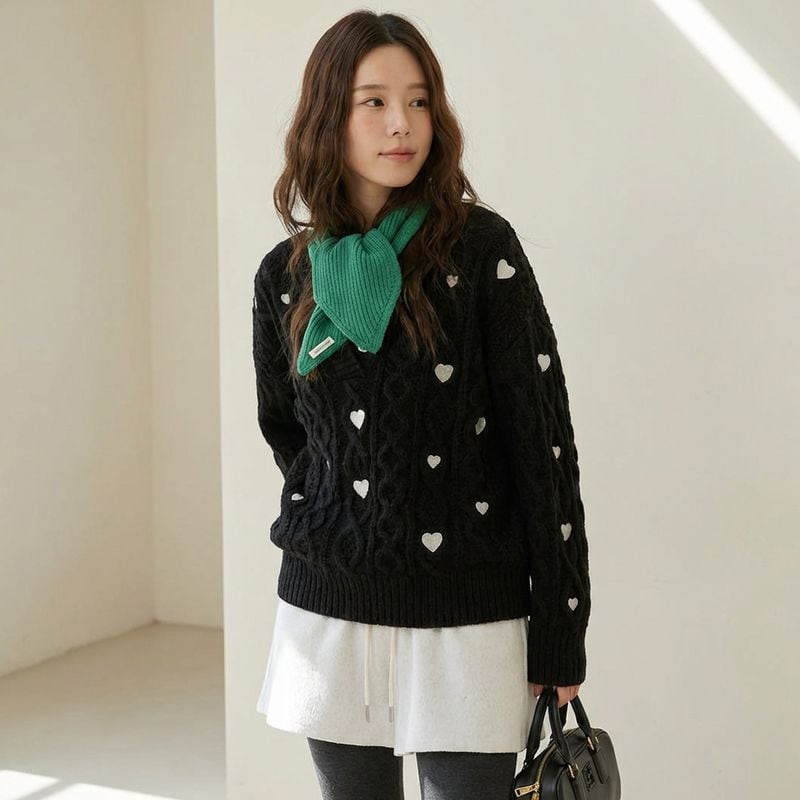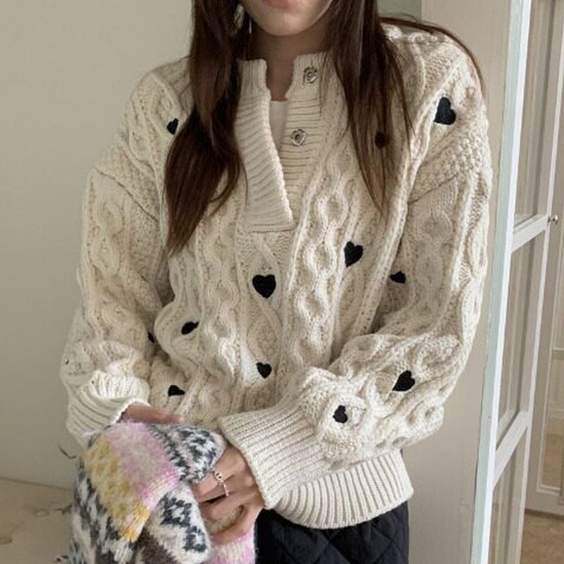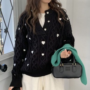 立体感のあるケーブル編みと、さりげなくあしらわれたハートモチーフ刺繍が大人可愛いニットトップス。