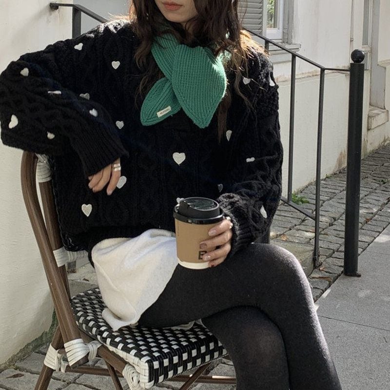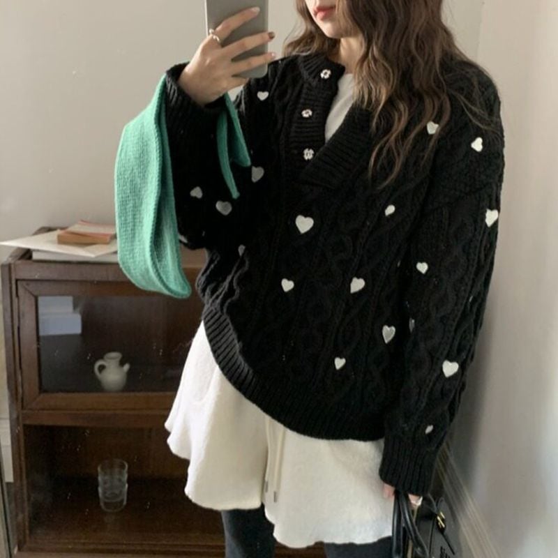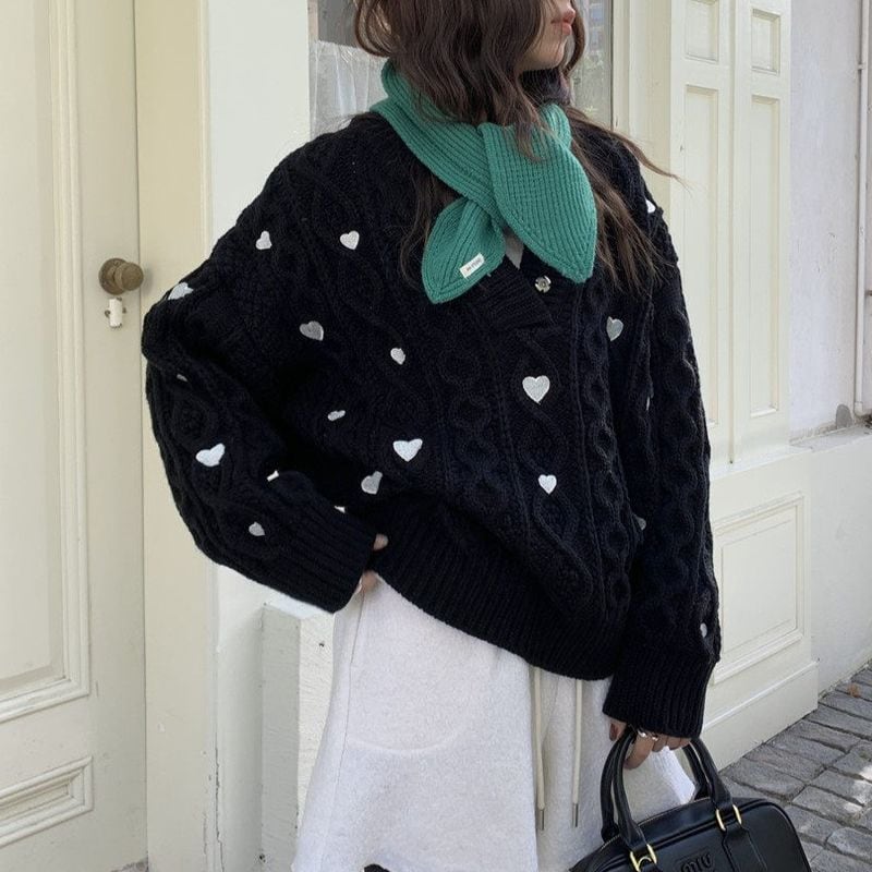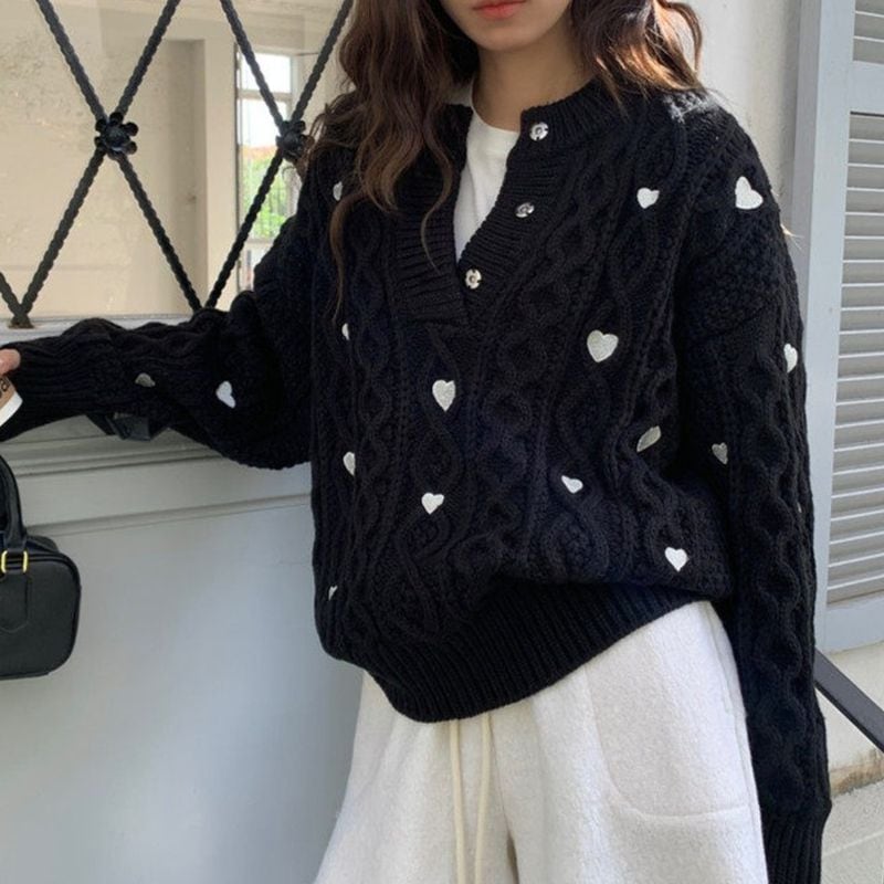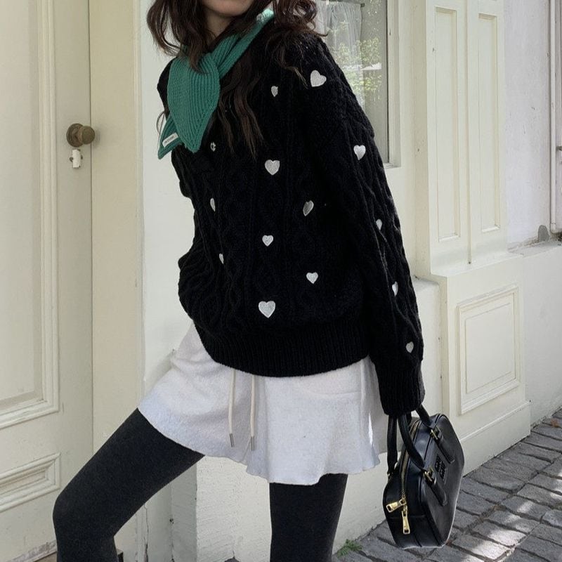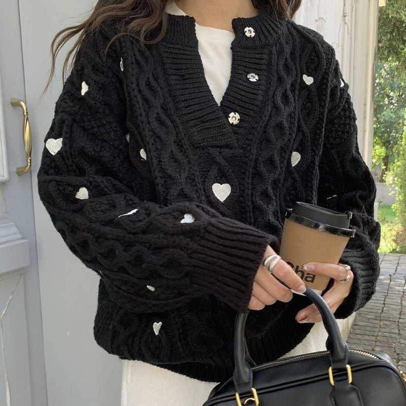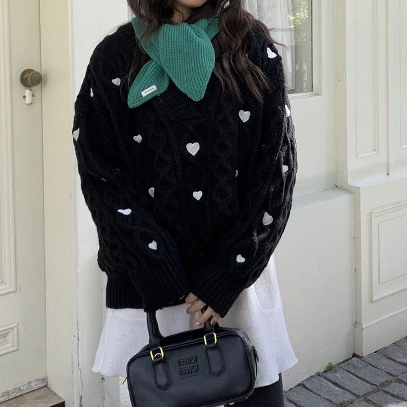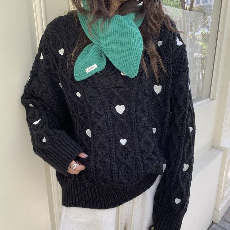 立体感のあるケーブル編みと、さりげなくあしらわれたハートモチーフ刺繍が大人可愛いニットトップス。