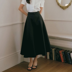 ウエスト位置を高めに設定し、タックを入れることで腰まわりはすっきり、裾に向かってきれいに広がるフレアシルエットに仕上げました。