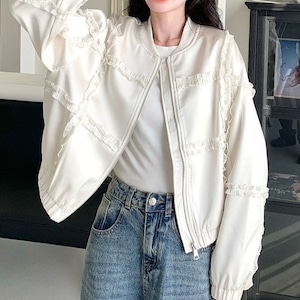 さっと羽織るだけで、コーディネートに大人可愛いアクセントを添えてくれるジップアップブルゾン。全体に施されたフリルラインが、カジュアルなブルゾンにほんのり甘さをプラスし、女性らしい印象に仕上げてくれます。