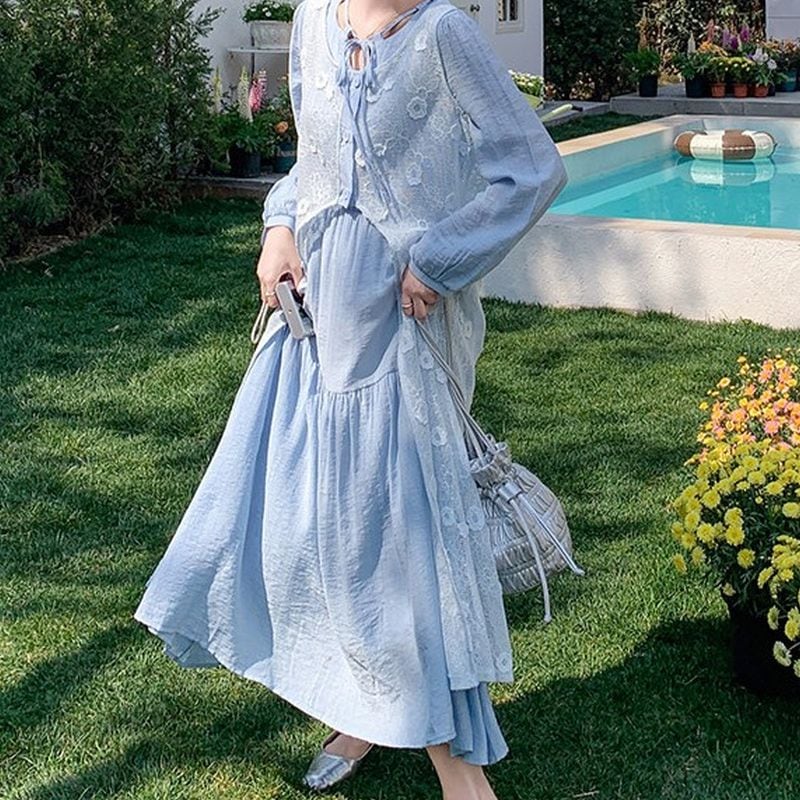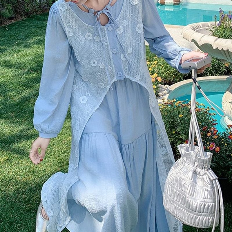 (2点セット)ネックリボンティアードワンピース+フラワーレースジレ L1168