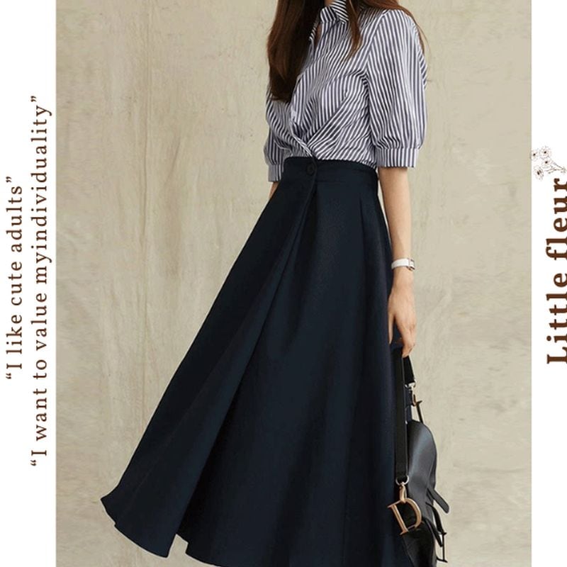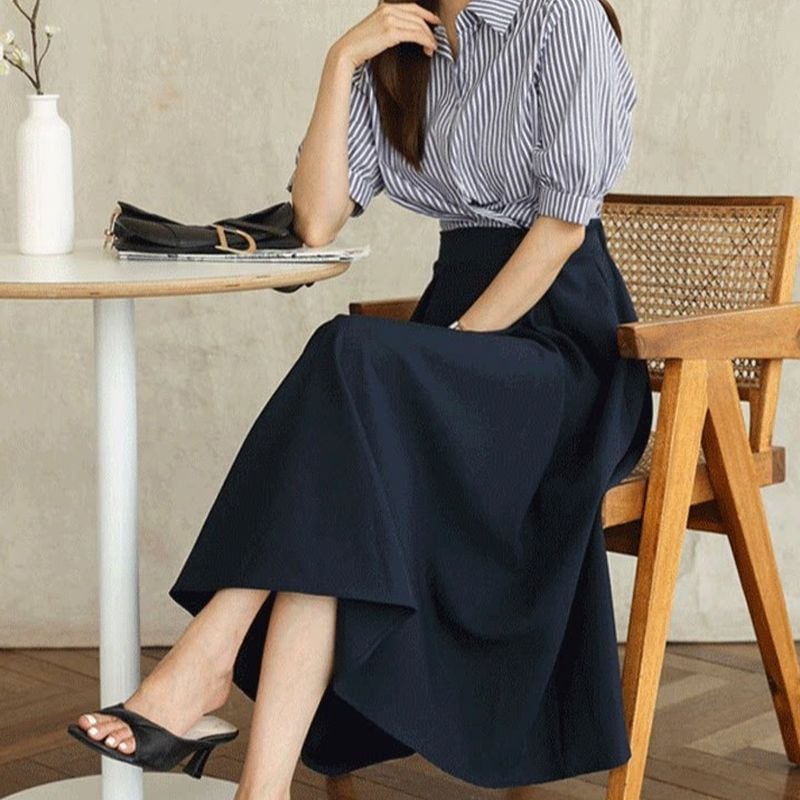 広がりすぎないAラインシルエットが、すっきりとした印象を与えつつ女性らしさを引き立てます。
