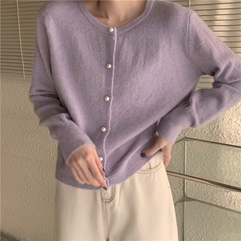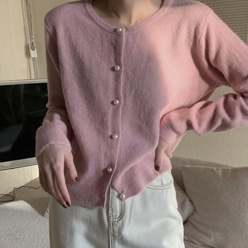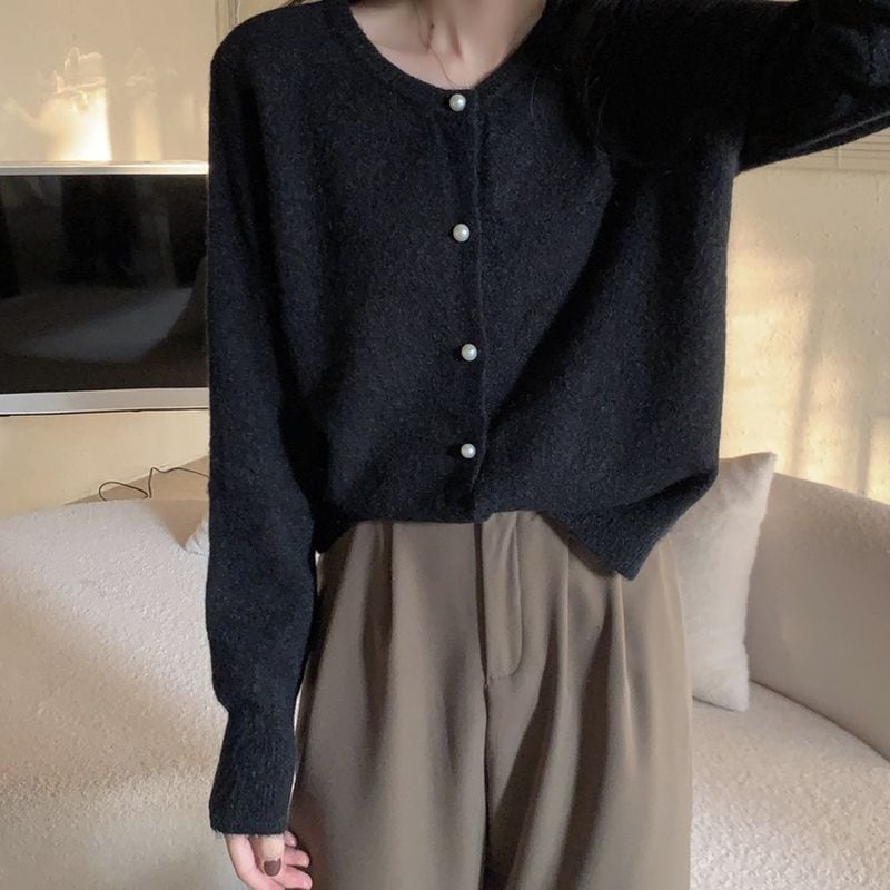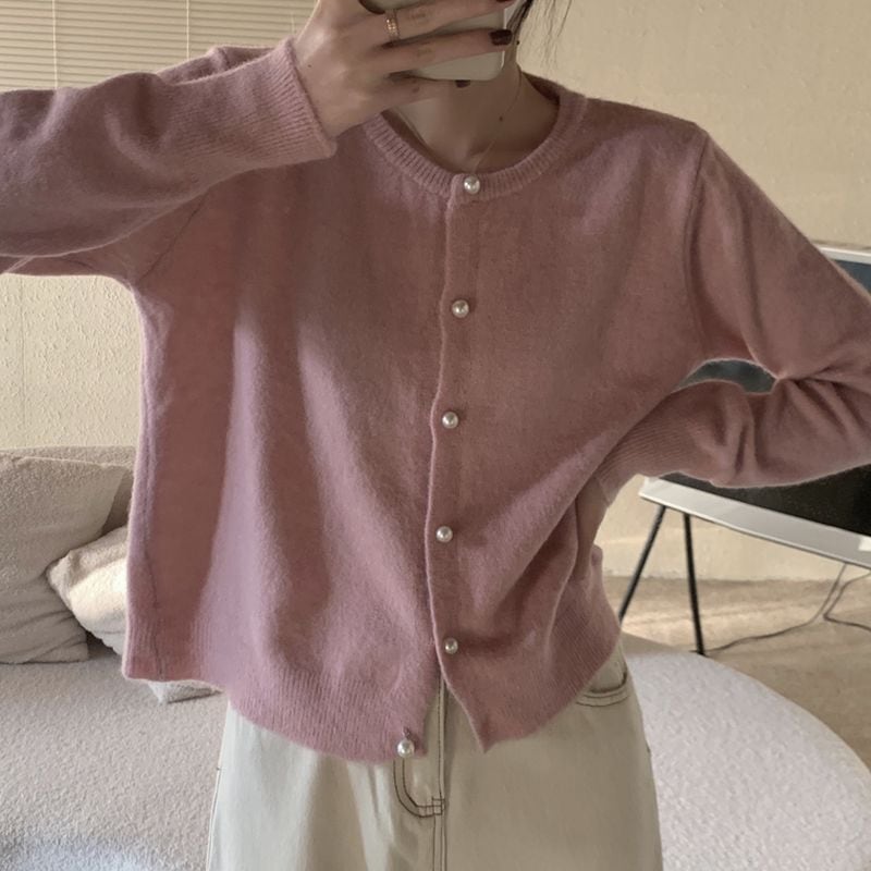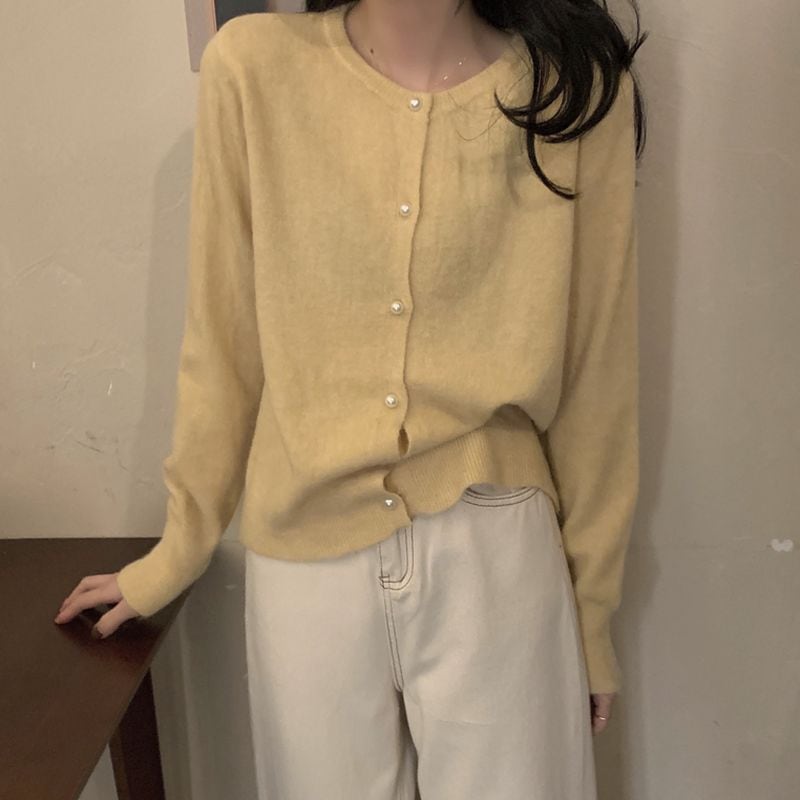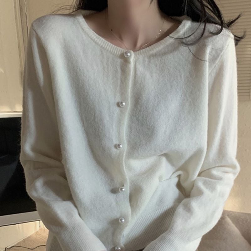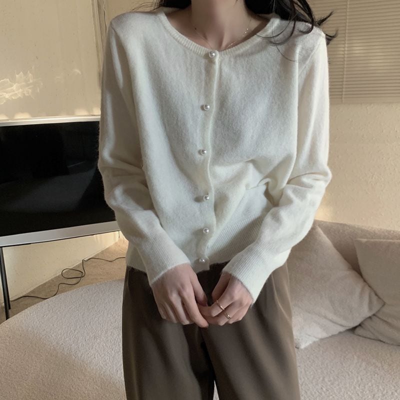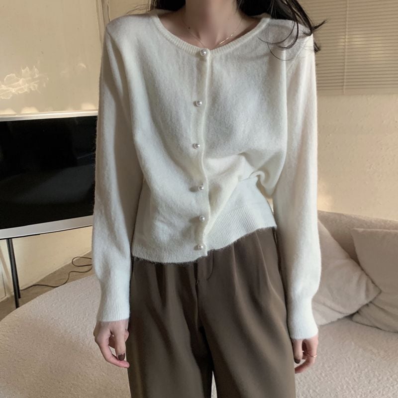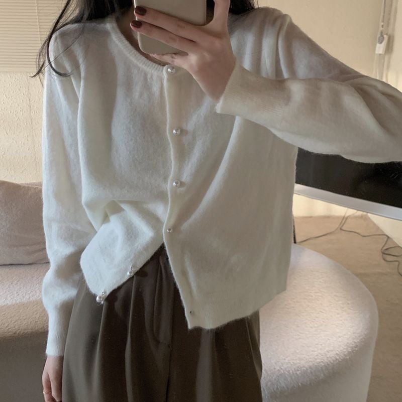 ラウンドネックに小ぶりのパールで上品な着こなしが決まる1枚。