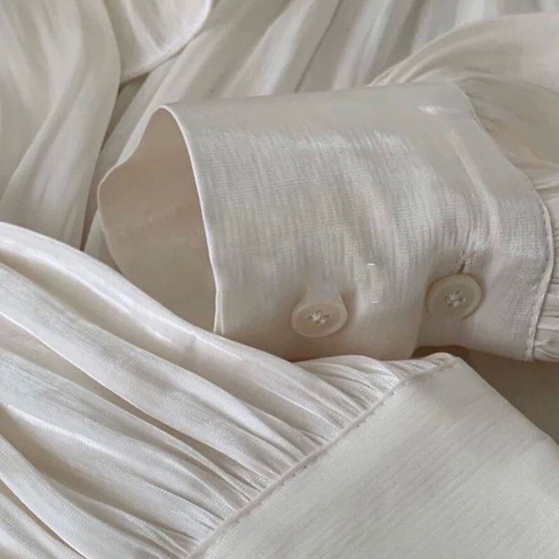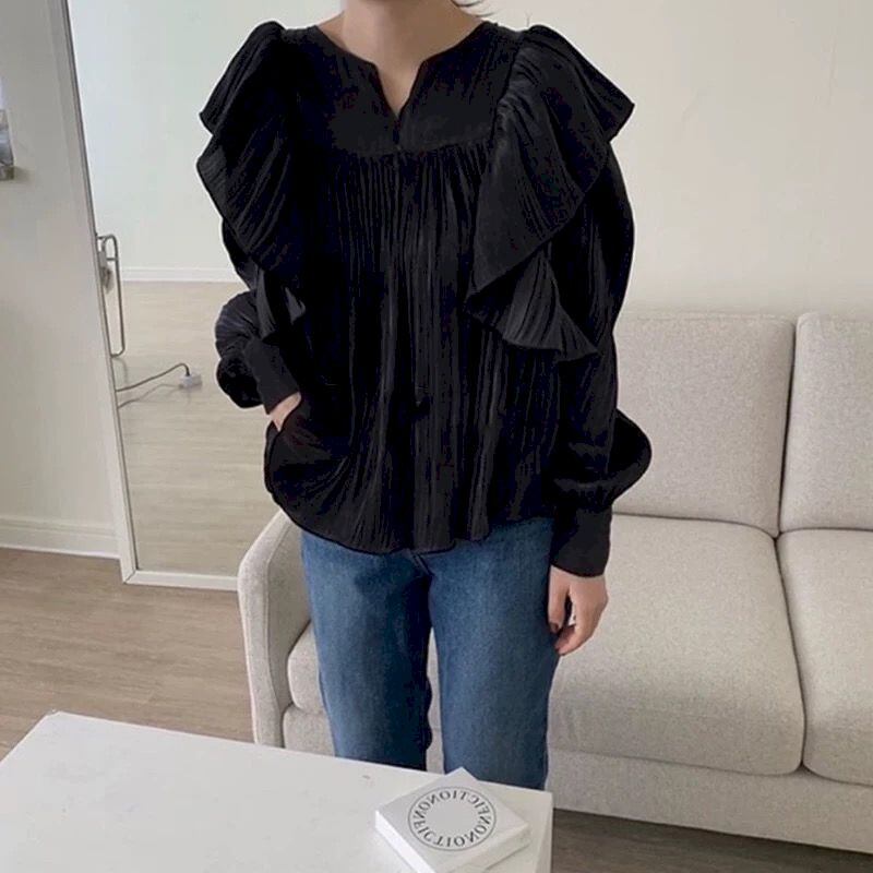 大きなドレープとギャザーが目を惹く大人可愛い印象のブラウス。