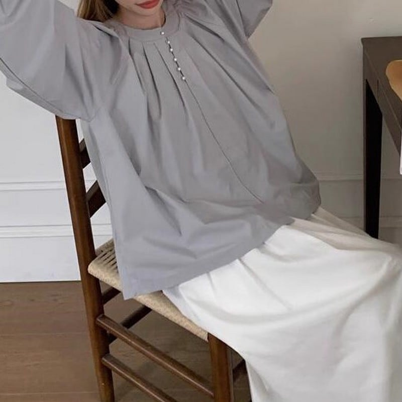 胸元の1列に並んだパールボタンが可愛く、シンプルながらもデザイン性のあるアイテムなので、