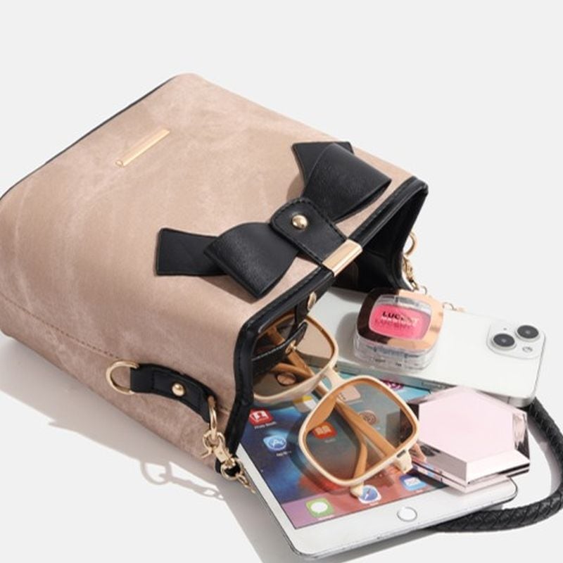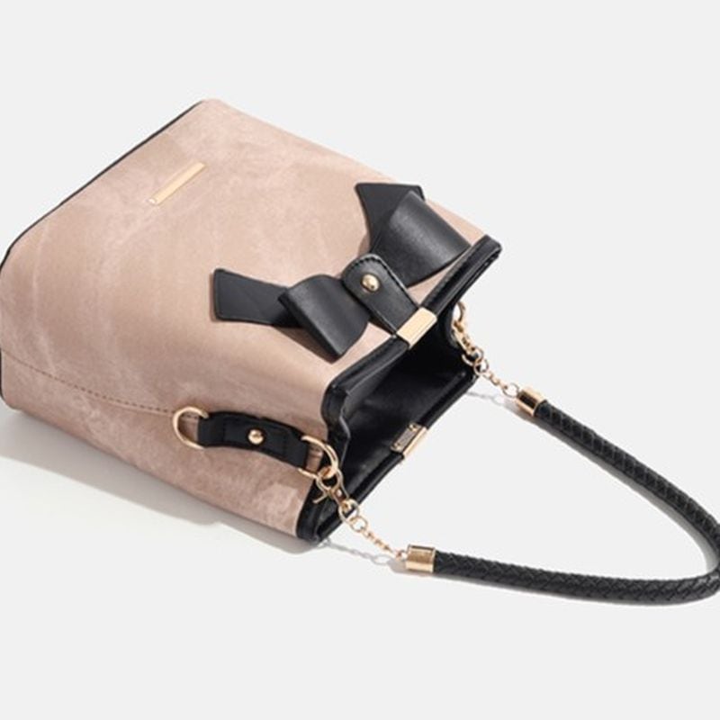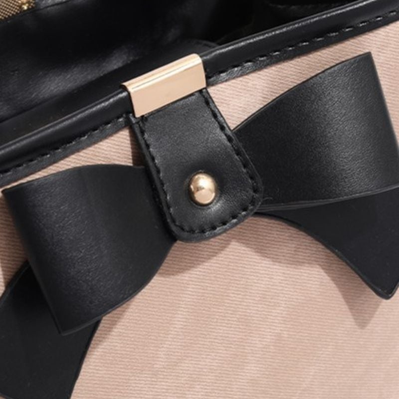 つるっとした生地のニュアンスベージュに、存在感のあるブラックのリボンがアクセントを加えたデザインです。