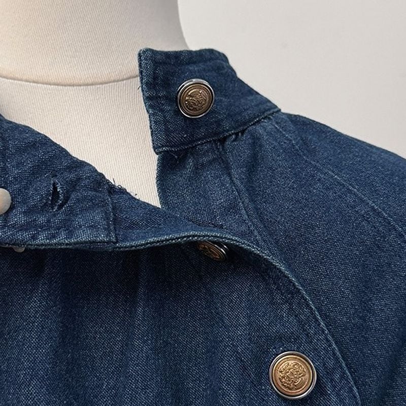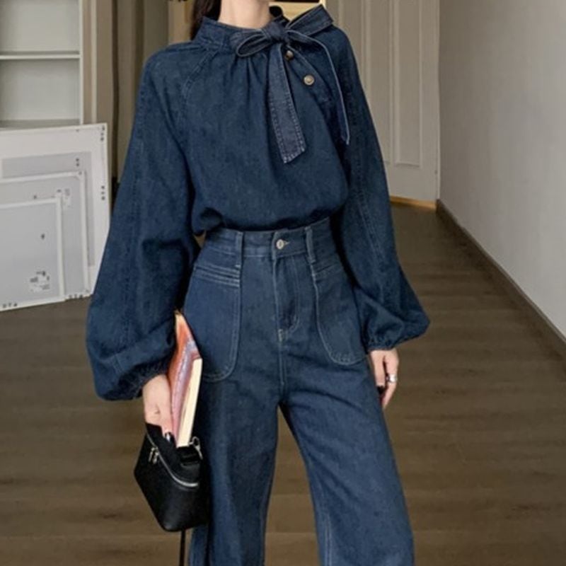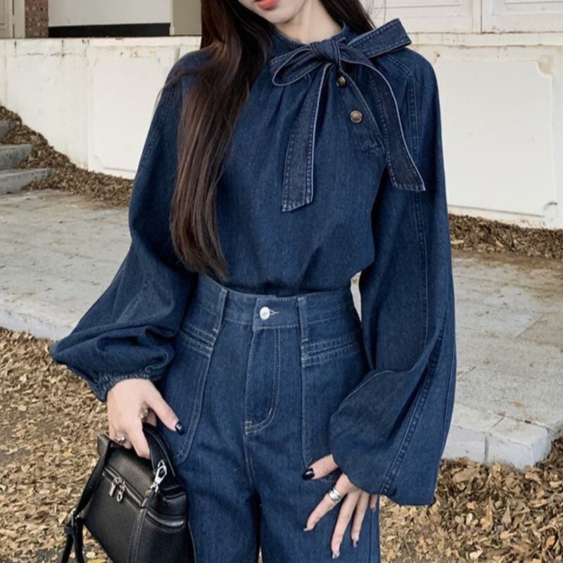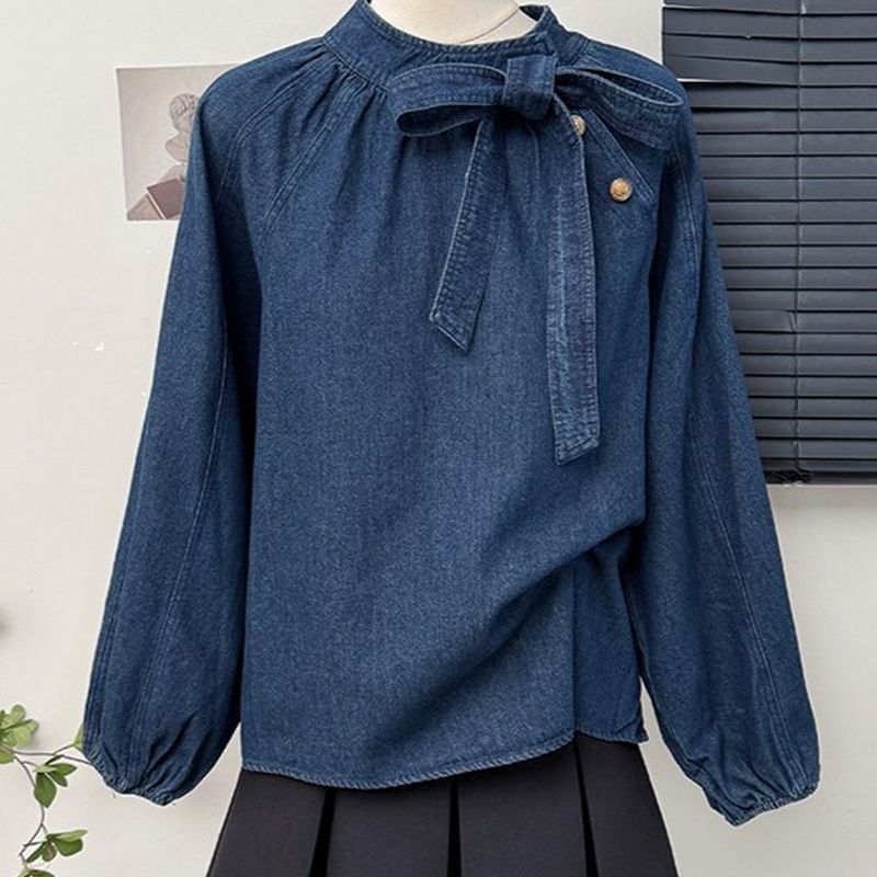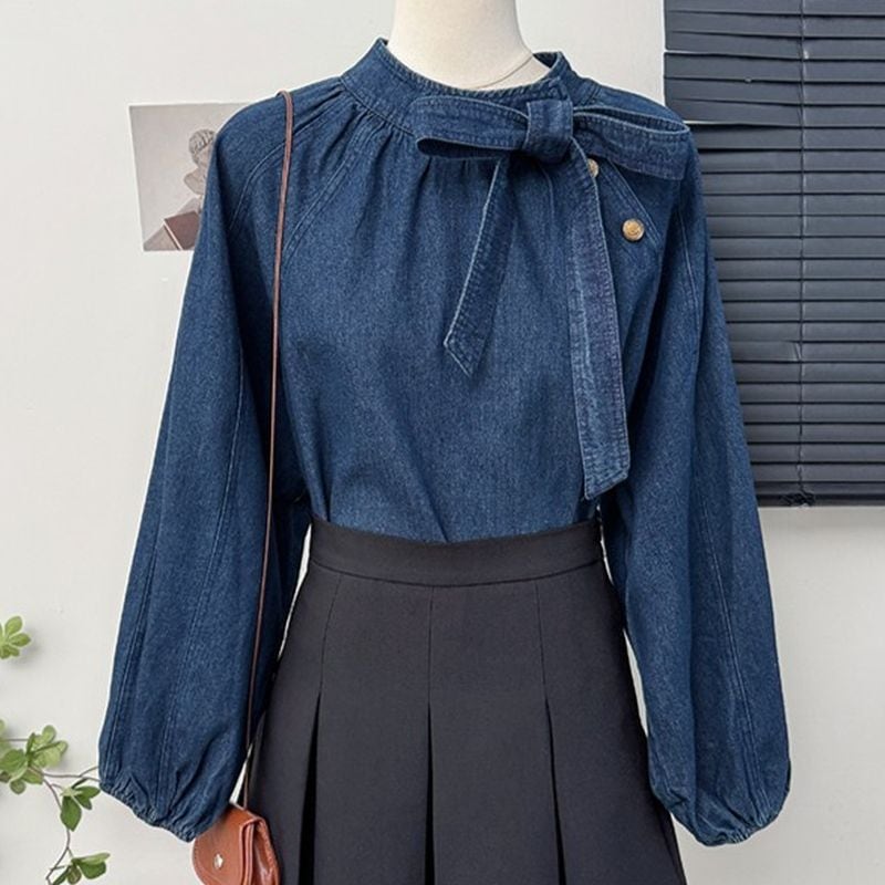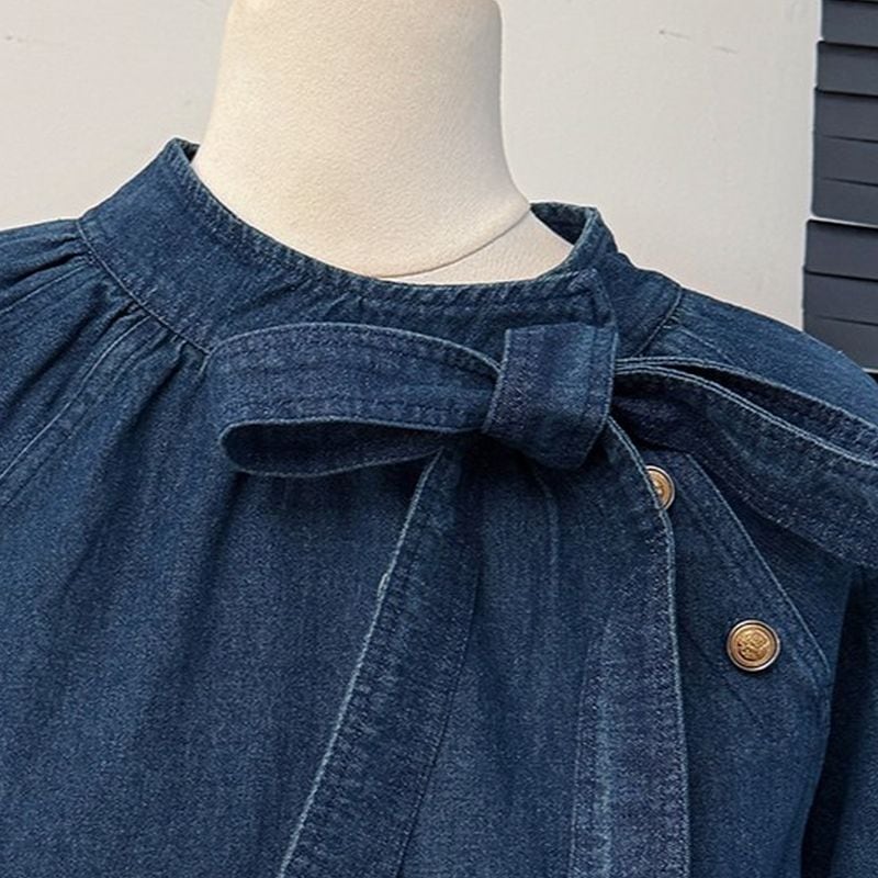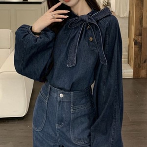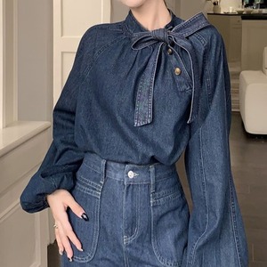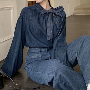 襟元には取り外し可能なデニム製のボウタイが付いており、気分やコーデに合わせてアレンジ自在。ふんわりとしたパフスリーブがフェミニンな印象をプラスしつつ、カジュアルなデニム生地で程よい抜け感を演出します。